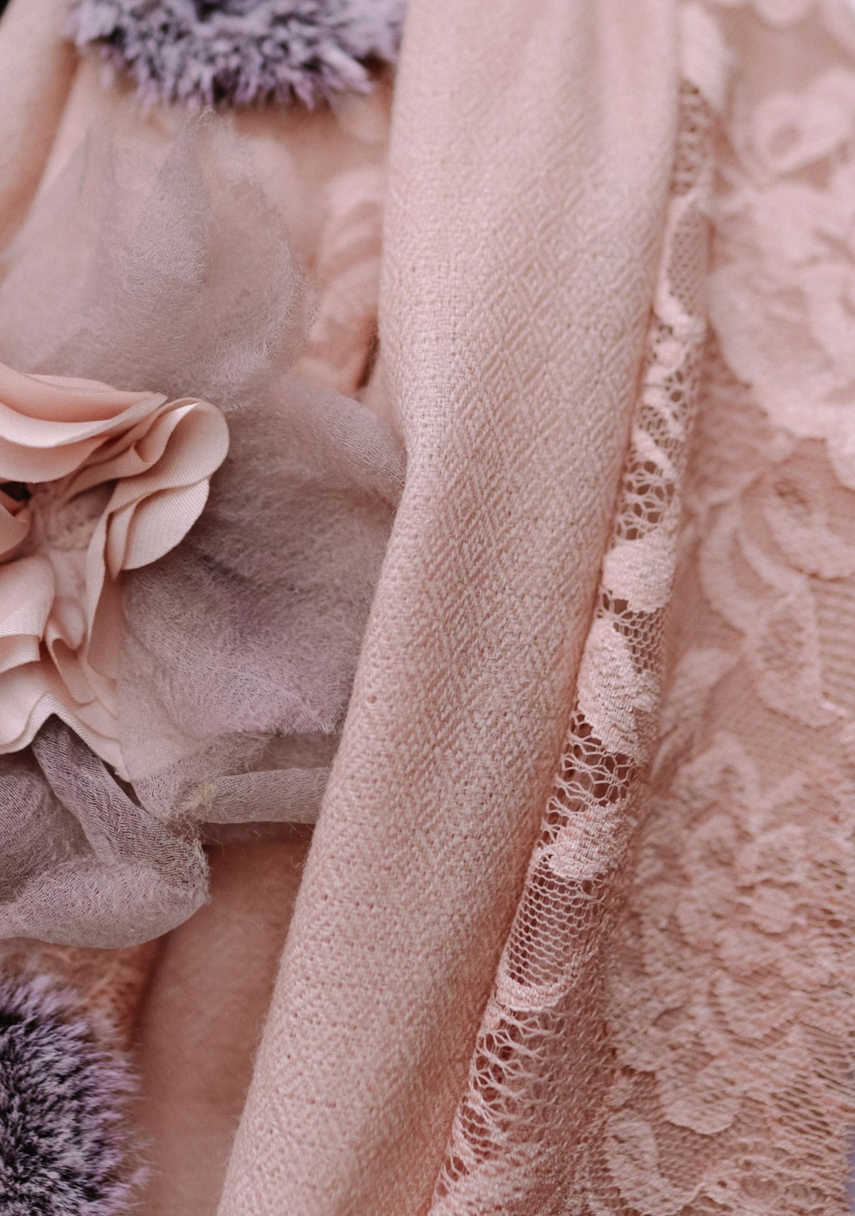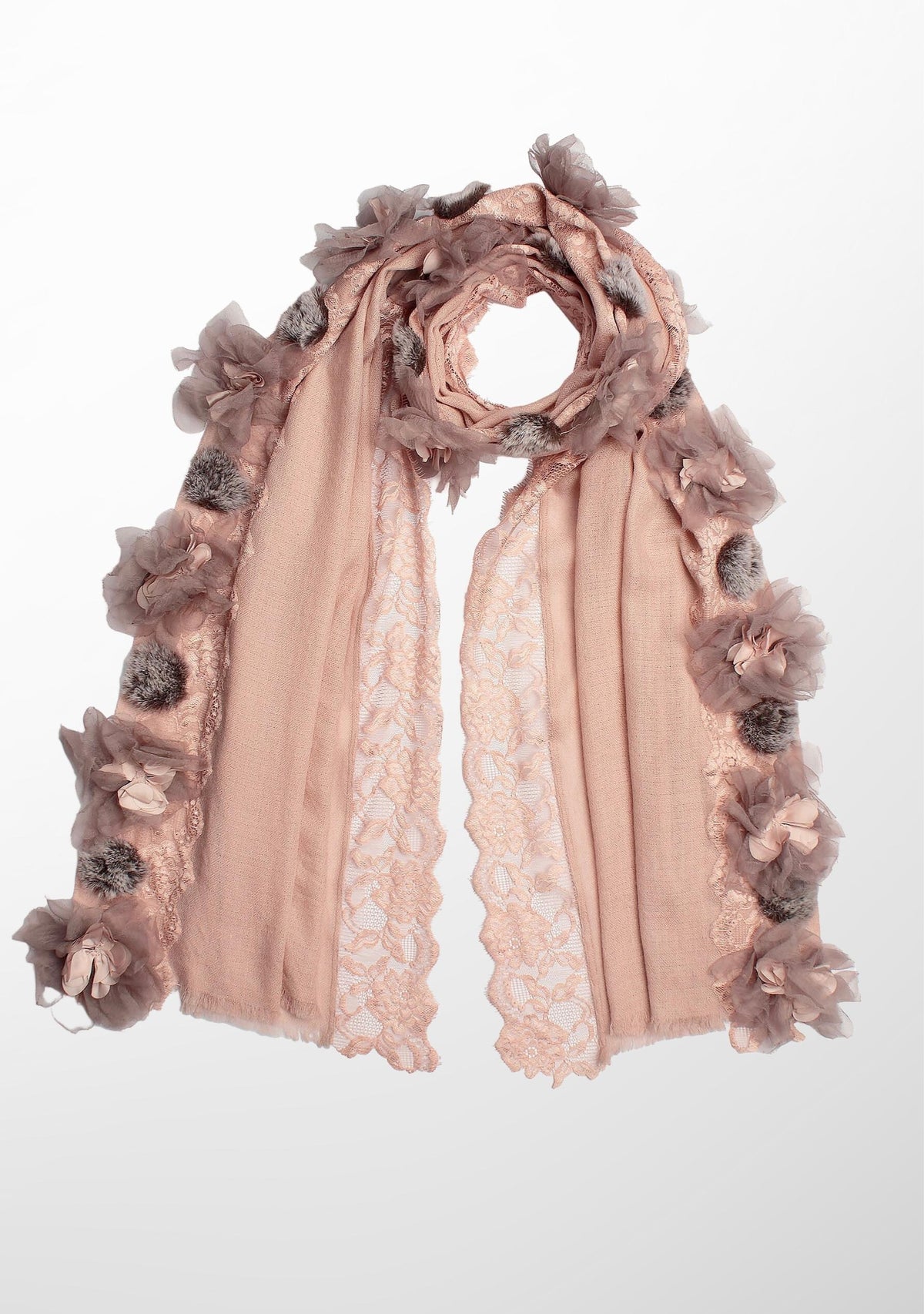 This unique and exquisite light copper scarf is crafted from a luxuriously fine cashmere. It is adorned with a delicate tonal light copper filigree lace and further complemented with bold tonal light copper 3D floral appliques on one side. Adding a touch of whimsical charm, the floral appliques are very cleverly intertwined with contrasting gray faux fur pom poms. All in all, this makes for a stunning, eye-catching accessory that is a must-have for any discerning patron who wants to make a fashion statement whilst remaining comfortably warm.