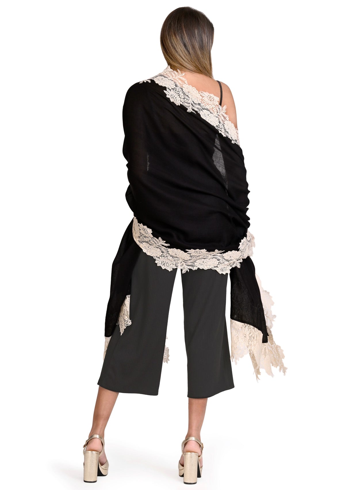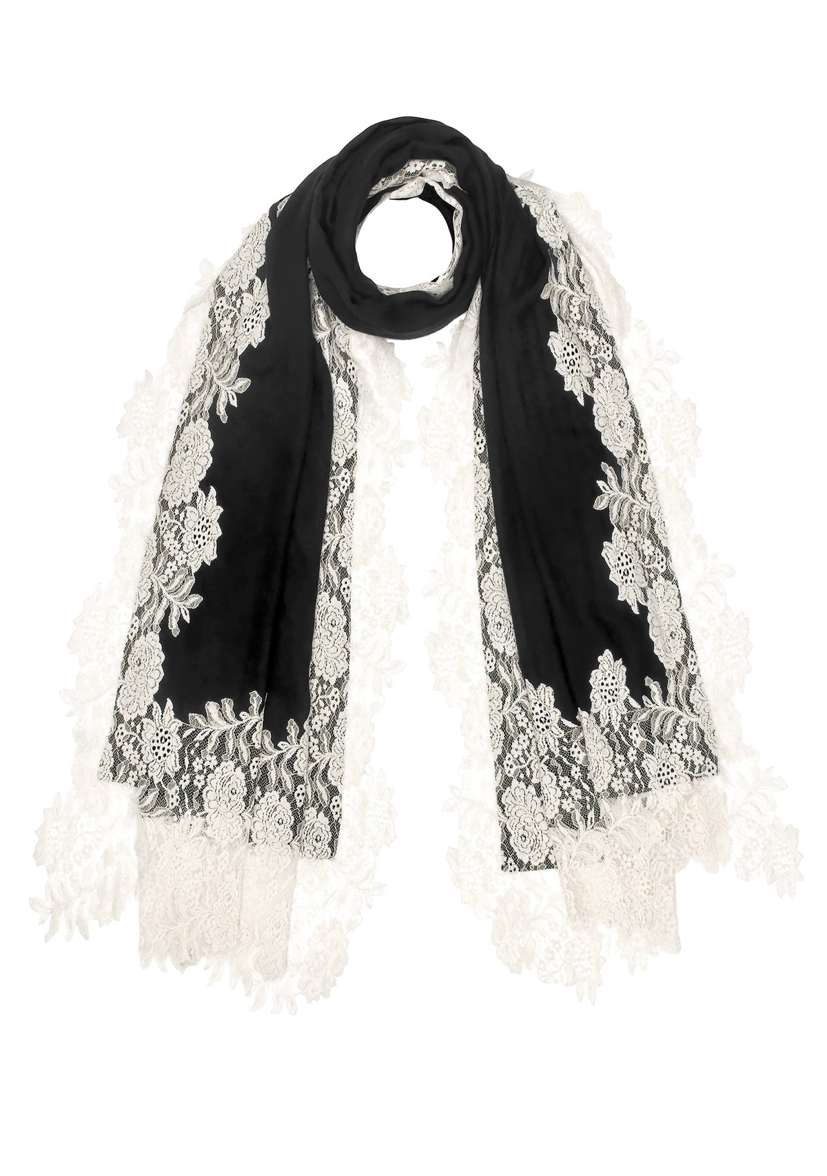 This black scarf is an all-time classic. Woven from a fine silk and wool blend, it features a contrasting beige floral lace border, making for the perfect anytime wear accessory whilst keeping you comfortably warm. For a casual or formal look, this is a must-have in every woman's wardrobe.