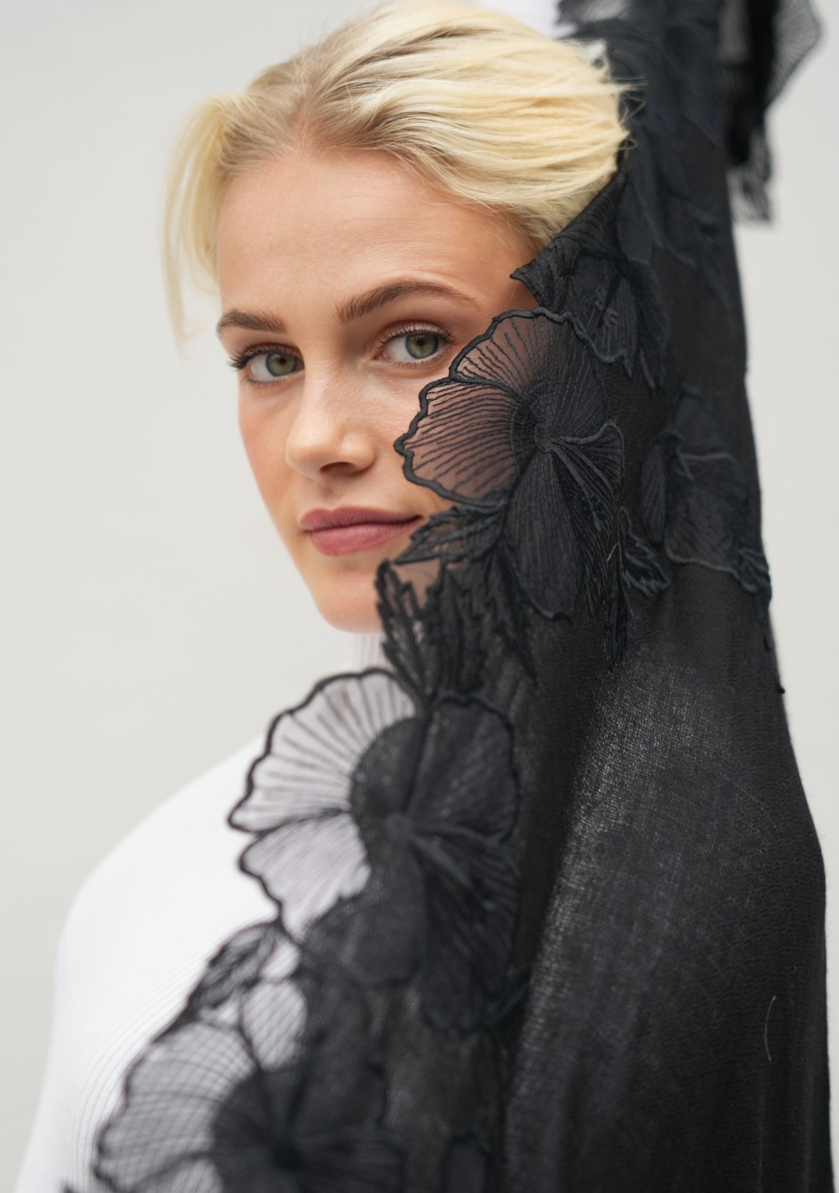 Wrap yourself in the ethereal beauty of this stunning black scarf featuring an eye-turning hibiscus floral embroidery border handcrafted in a tonal black color. Woven from the finest cashmere, this versatile and captivating scarf offers unparalleled style and oomph whilst keeping you comfortably warm. Embrace the opulence of cashmere and express your unique fashion sense by adorning this statement piece. Black is black but this piece is so much more.
