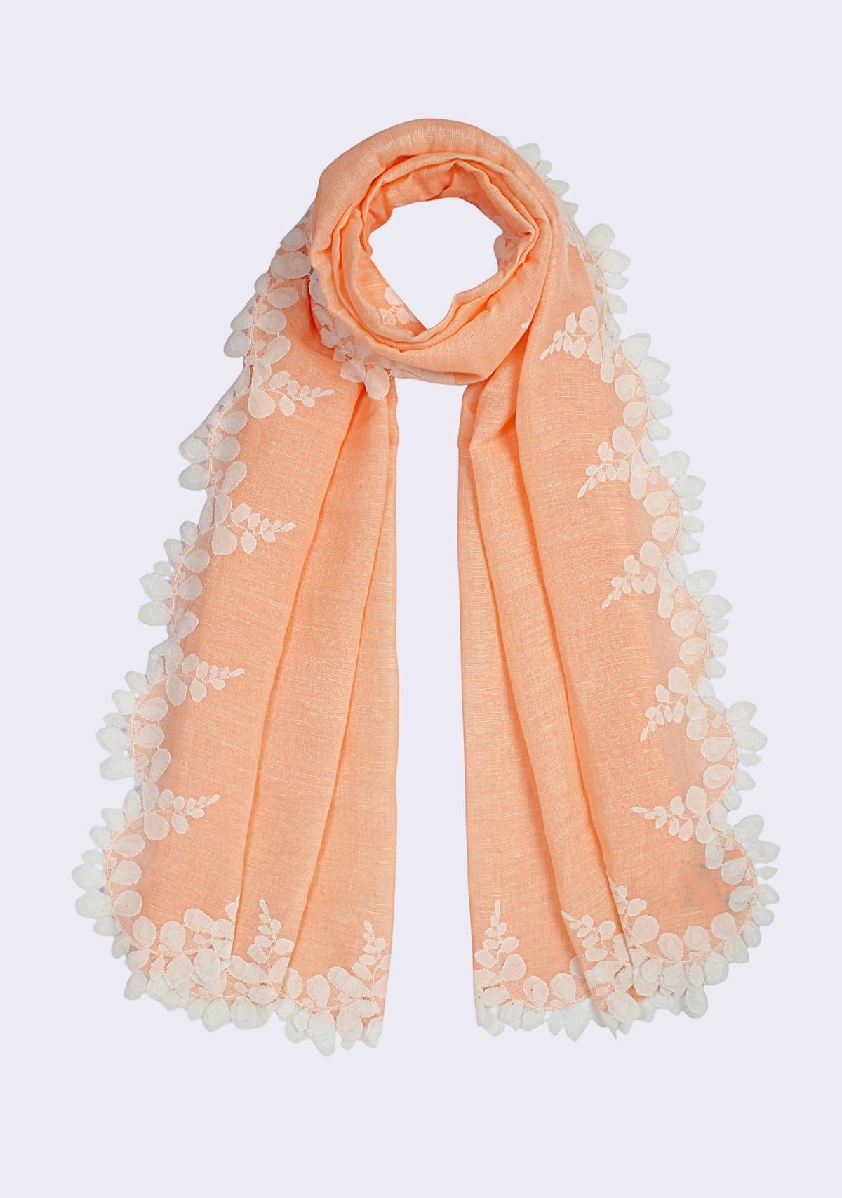 This wispy light peach scarf, woven from a linen and modal blend, features a contrasting ivory bold scalloped edging lace border. A chic and fashionable add-on to any casual outfit.