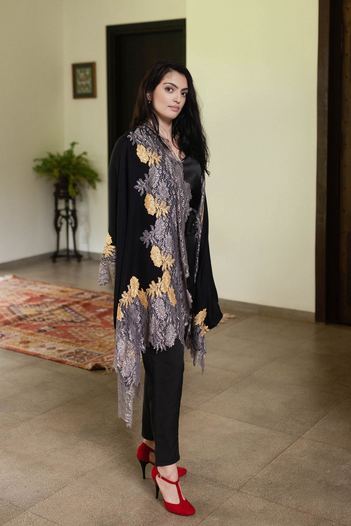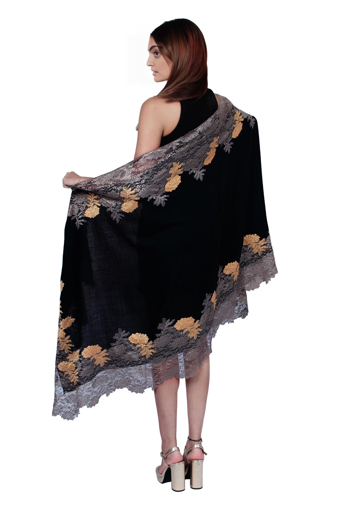 Black Wool & Silk Scarf Antique Silver & Dk. Gold Lace Sale price$362.00 USD