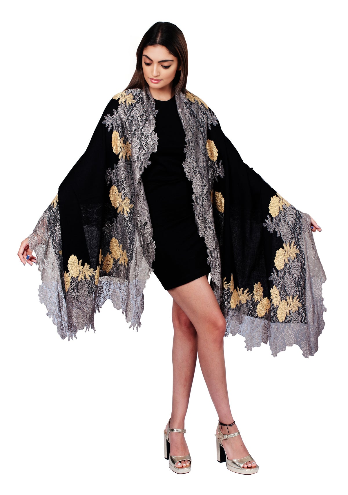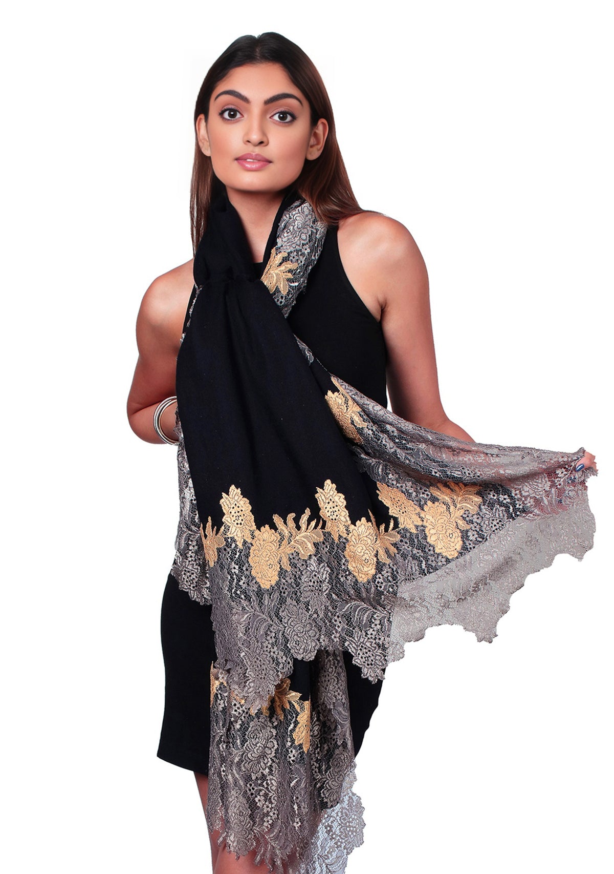 Crafted from a luxurious blend of wool and silk, this black scarf offers cozy warmth and sophistication. The stunning intertwined double-colored floral lace border in antique silver and dark gold creates a captivating visual contrast. Style yourself with this gorgeous accessory that epitomizes opulence whilst adding a touch of refined beauty to any evening out.