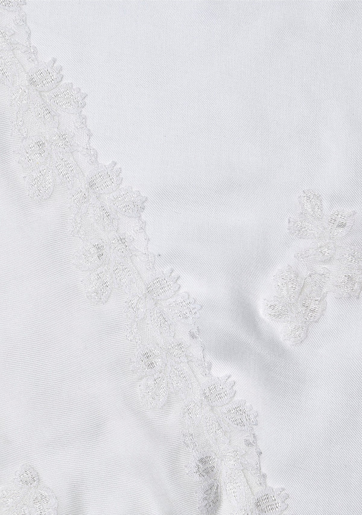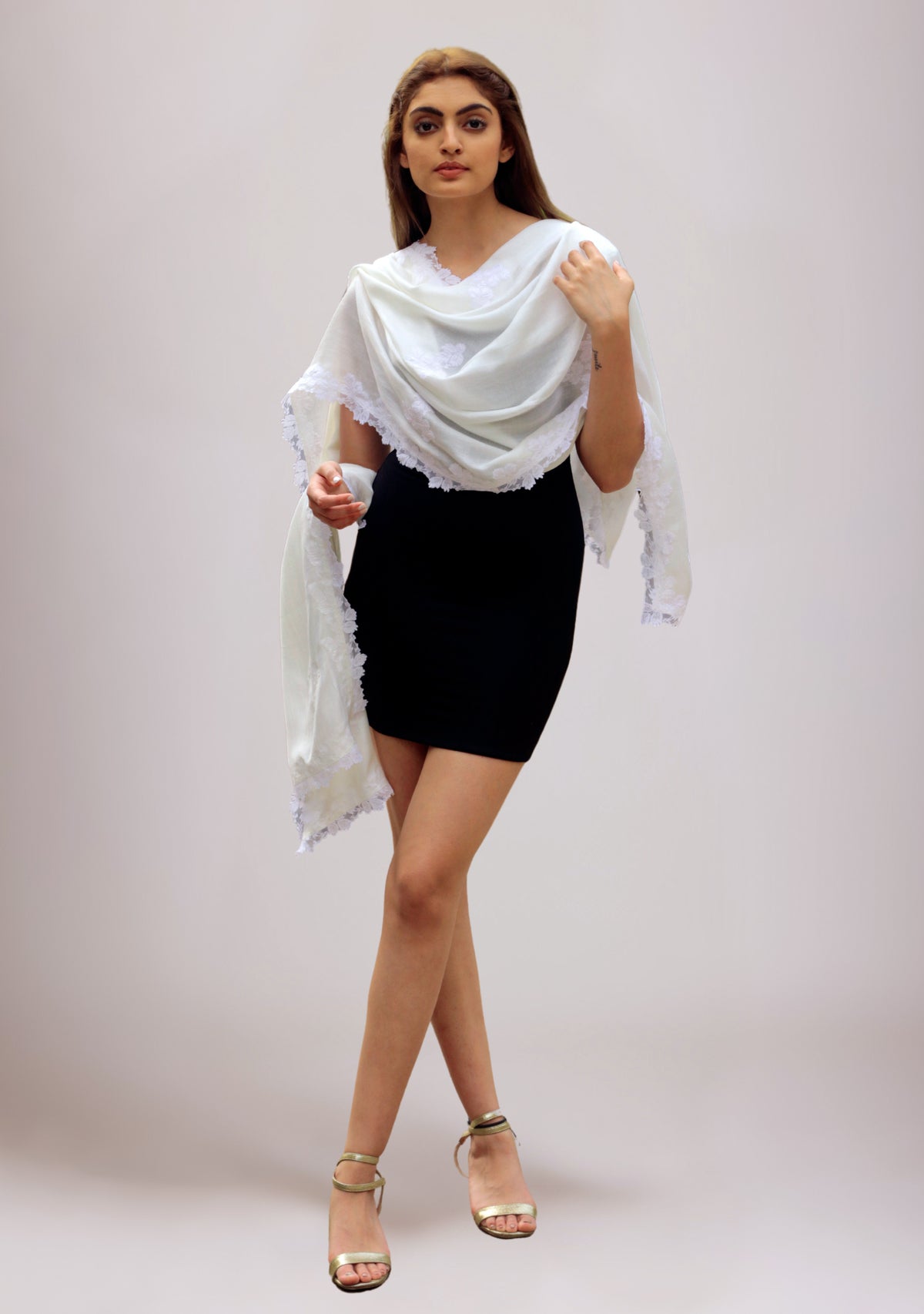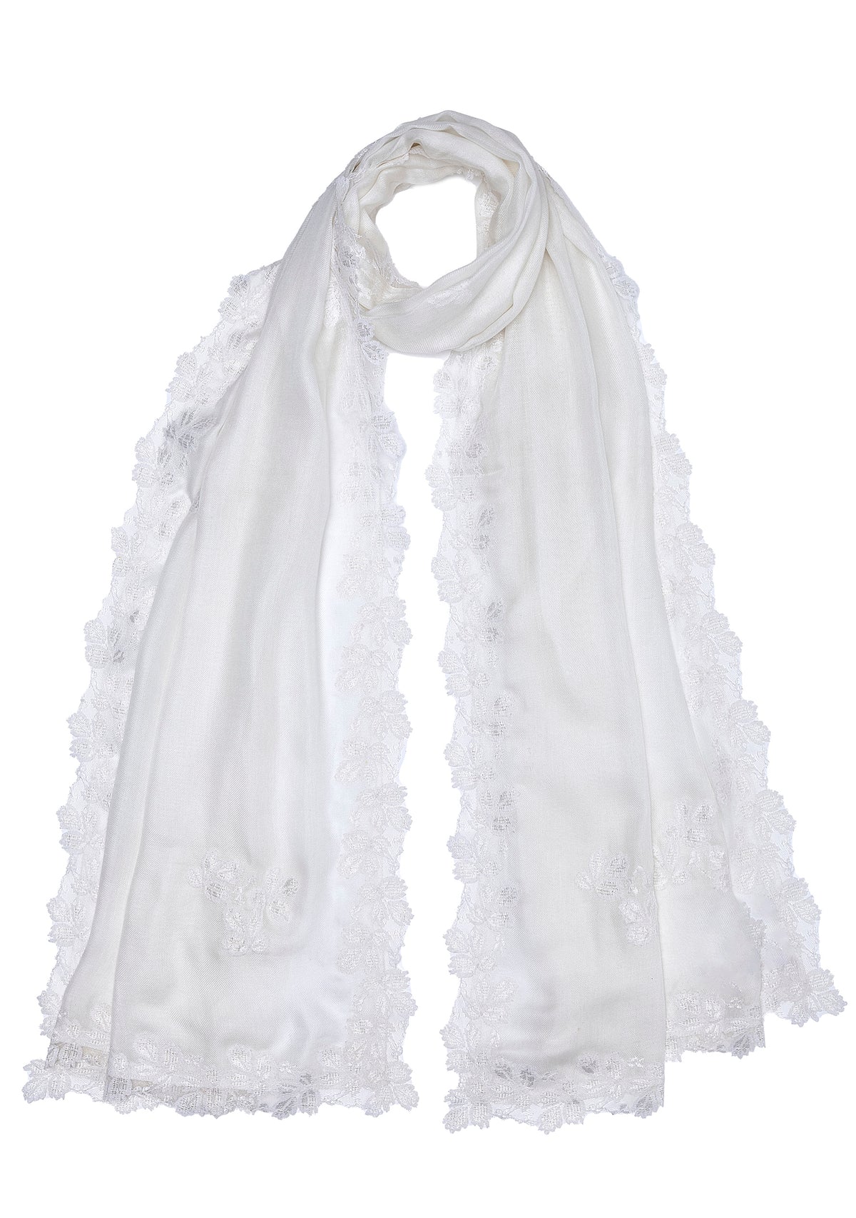 A Ivory scarf, woven from a very light modal, is bordered and hand appliqued with a tonal and delicate ivory leaf-patterned lace. This chic accessory can add fun and fashion to any casual outfit, as a bandana, belt, neck scarf or around the shoulders.