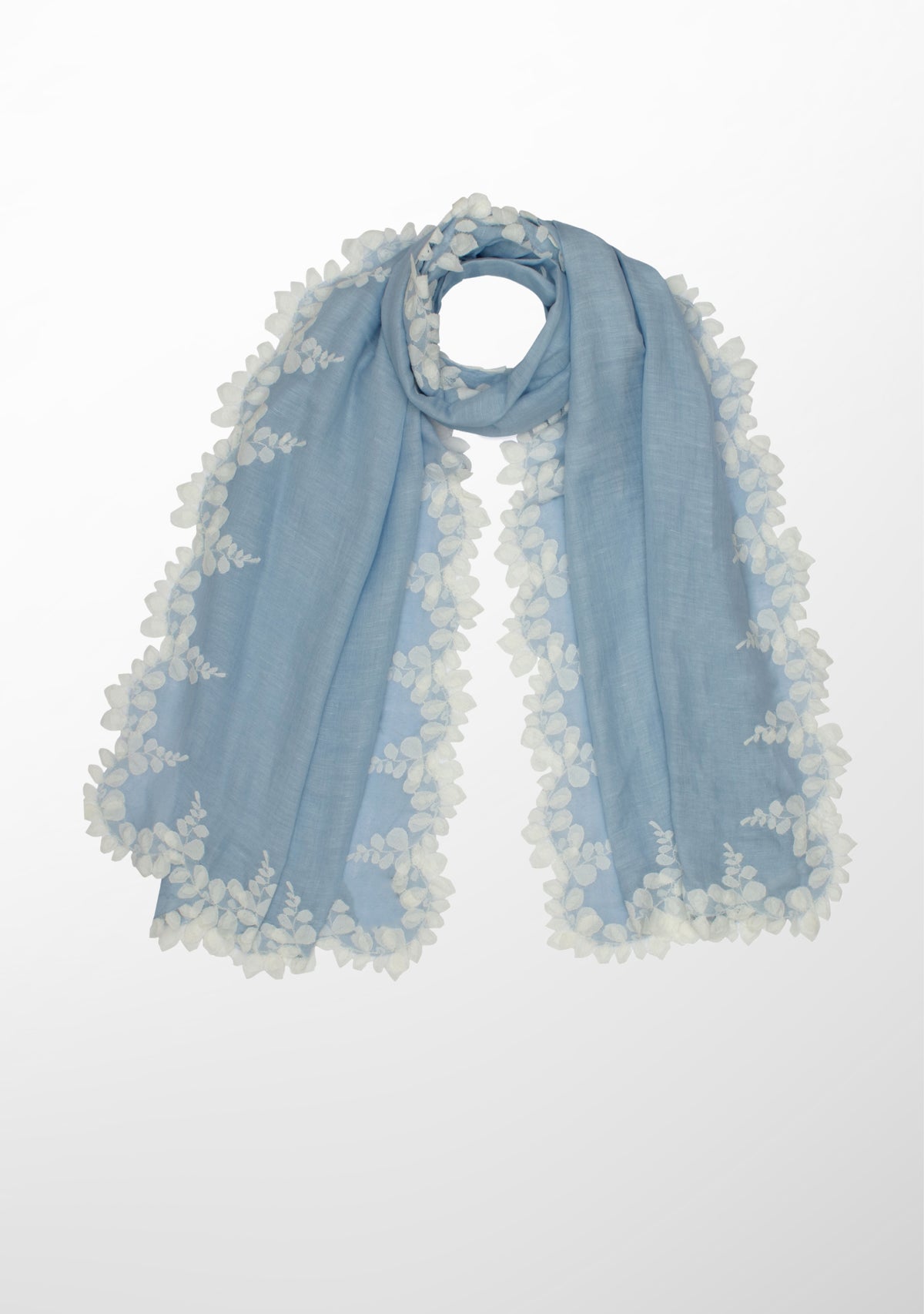 This wispy powder blue scarf, woven from a linen and modal blend, features a contrasting ivory bold scalloped edging lace border. A chic and fashionable add-on to any casual outfit.
