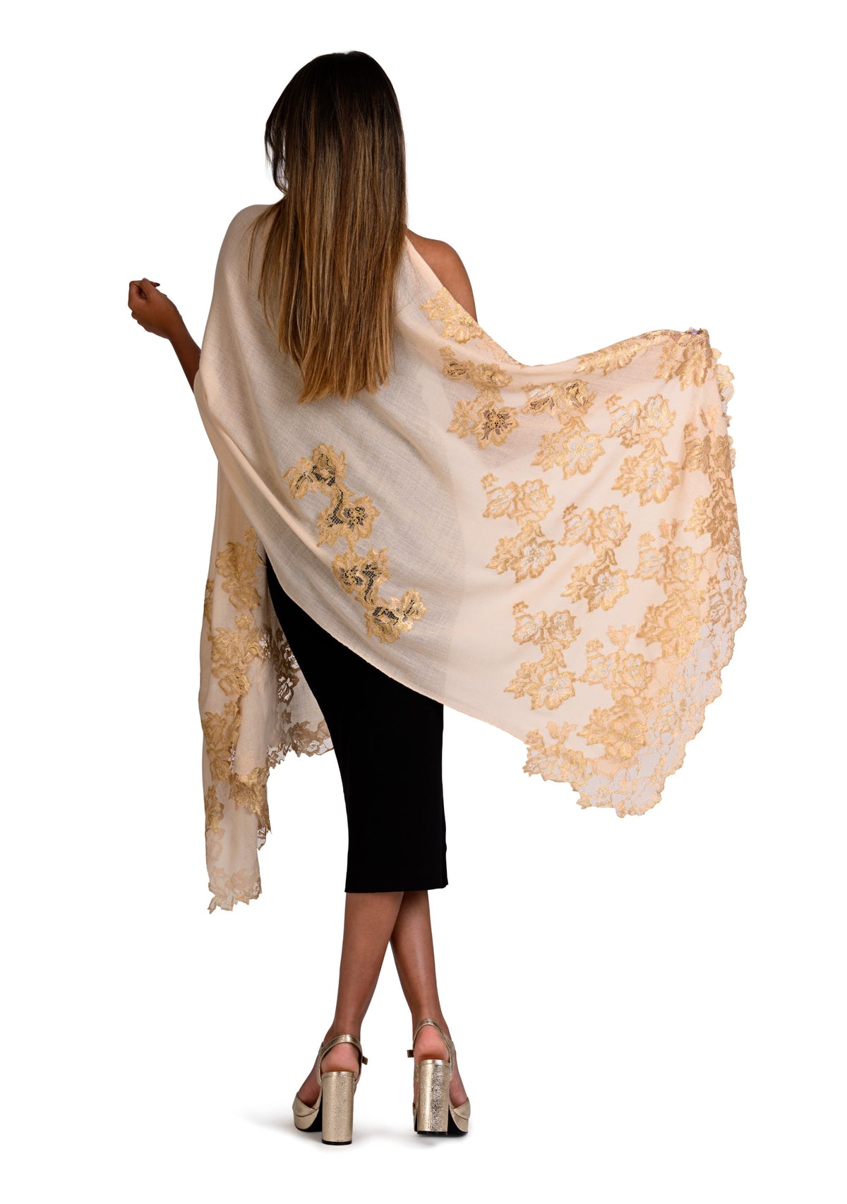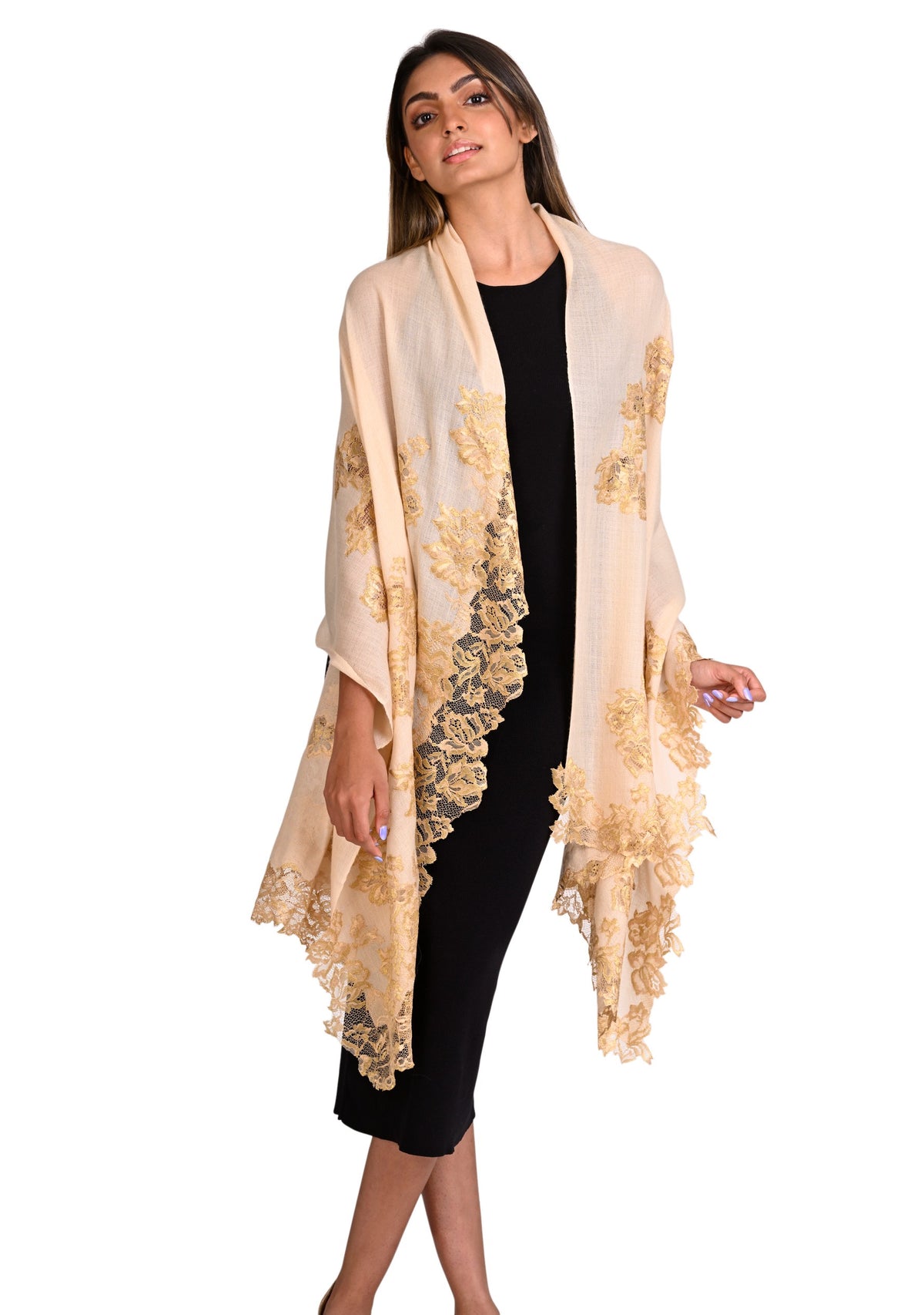 Woven from the finest cashmere, this beige scarf features an intricately handcrafted application of an exotic gold Chantilly lace extending inward in a vine pattern from the ends of the scarf. The luxurious cashmere fabric ensures both warmth and comfort, whilst the stunning lace application adds a touch of sophistication with unparalleled charm, giving this scarf timeless appeal with a modern edge. You can style yourself with versatile ease in multiple ways, making this scarf the perfect accessory for any formal occasion, day or night. Make heads turn with your elevated fashionista look.