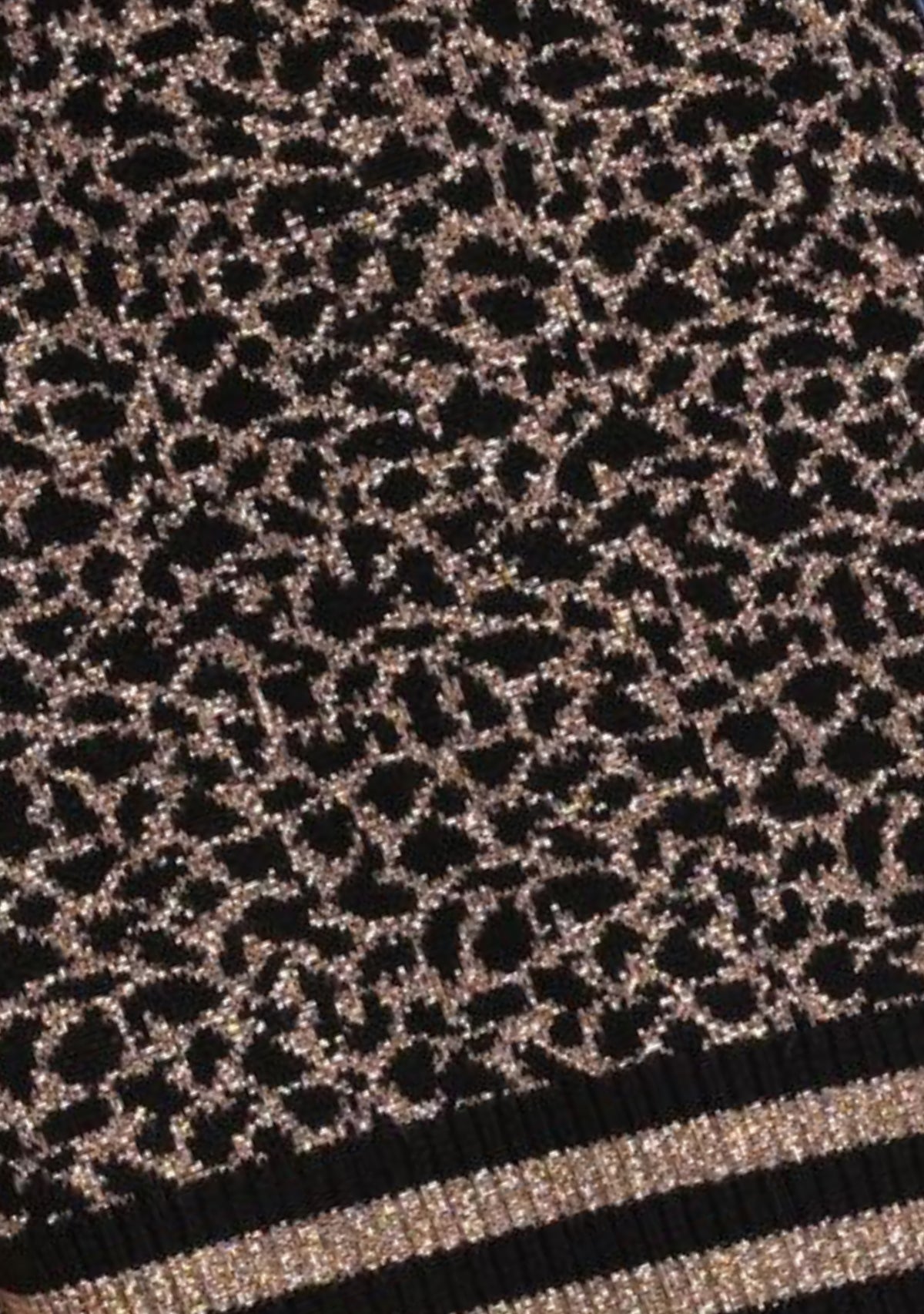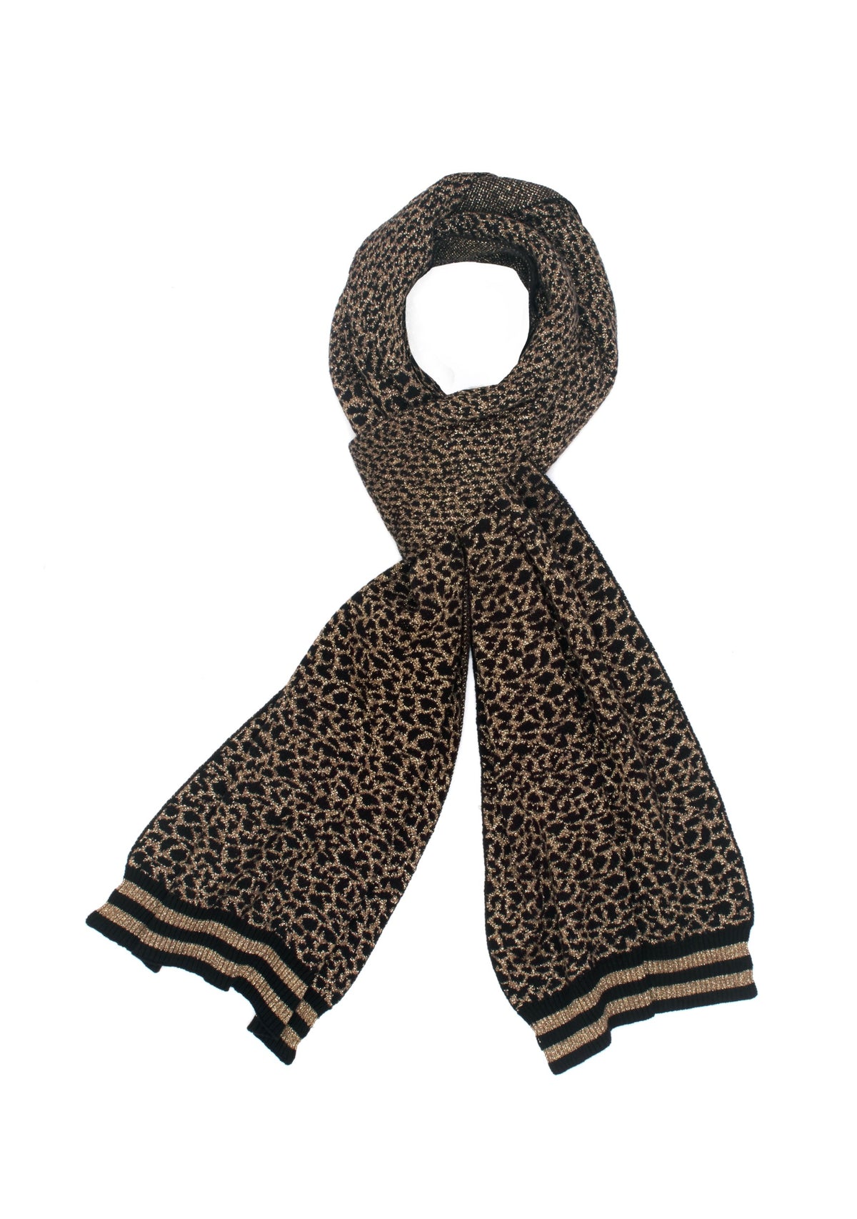 This black and gold tobacco brown scarf, crafted from a luxurious blend of cotton, viscose, and polyester, features a striking jacquard leopard design. Accented with black and tobacco brown lurex stripes at the ends, it adds a touch of shimmer and sophistication. Trendy and playful, this versatile accessory is perfect for everyday styling, effortlessly complementing any casual outfit. Its lightweight yet stylish design makes it an ideal choice for adding a bold, fashionable touch to your wardrobe, while ensuring comfort and ease.