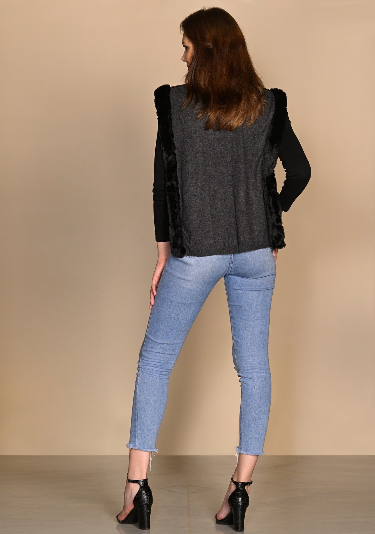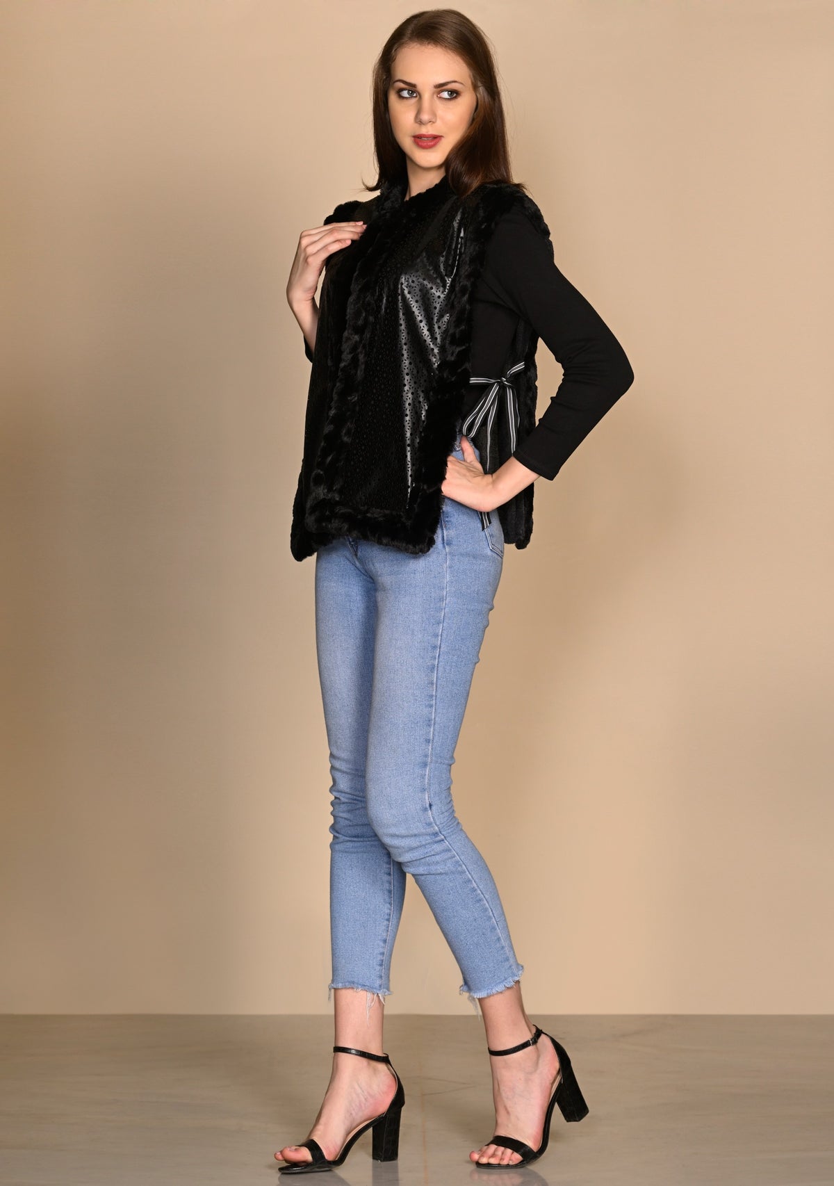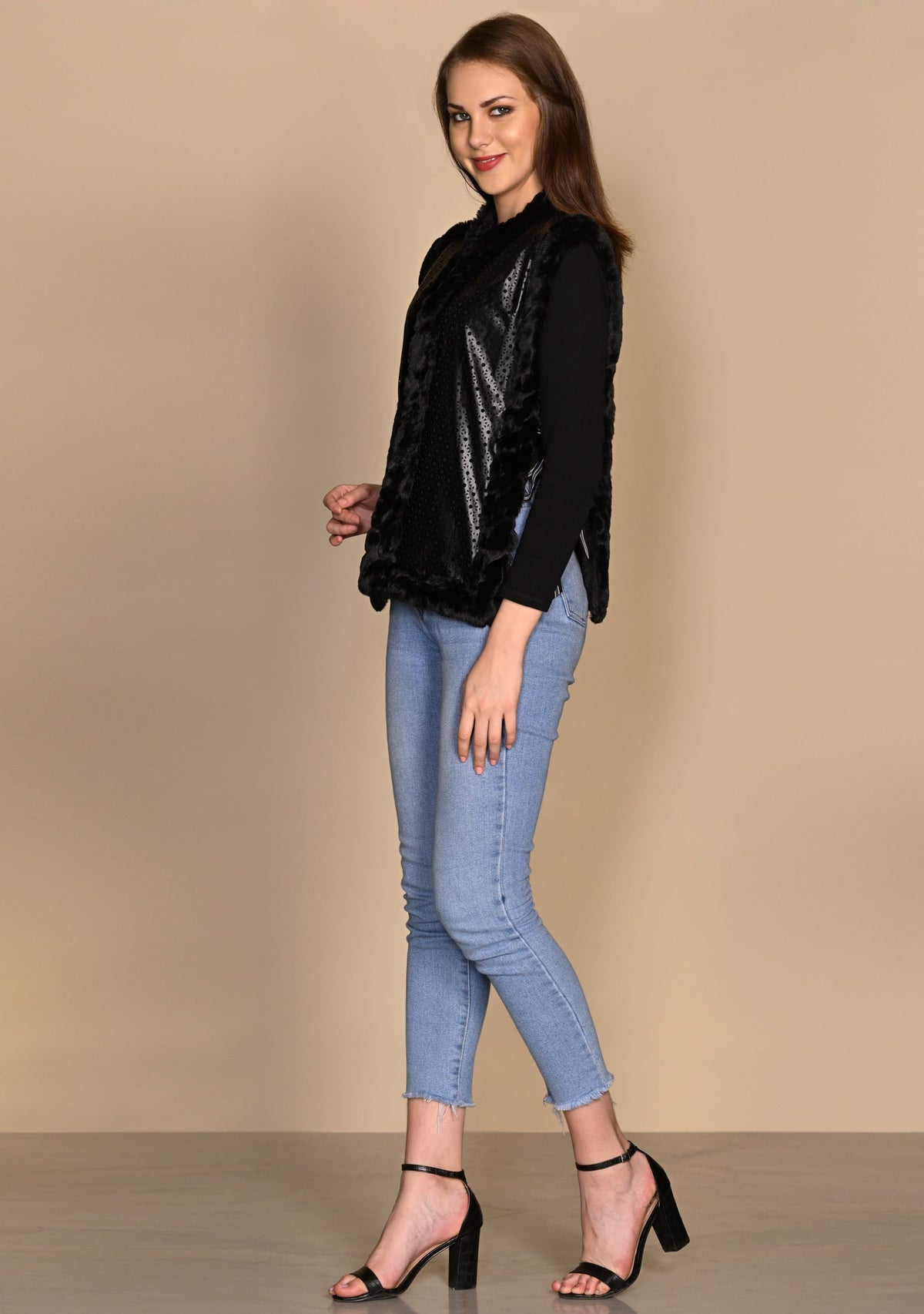 Black Faux Leather & Charcoal Melange Wool Sleeveless JacketBlack Faux Fur
