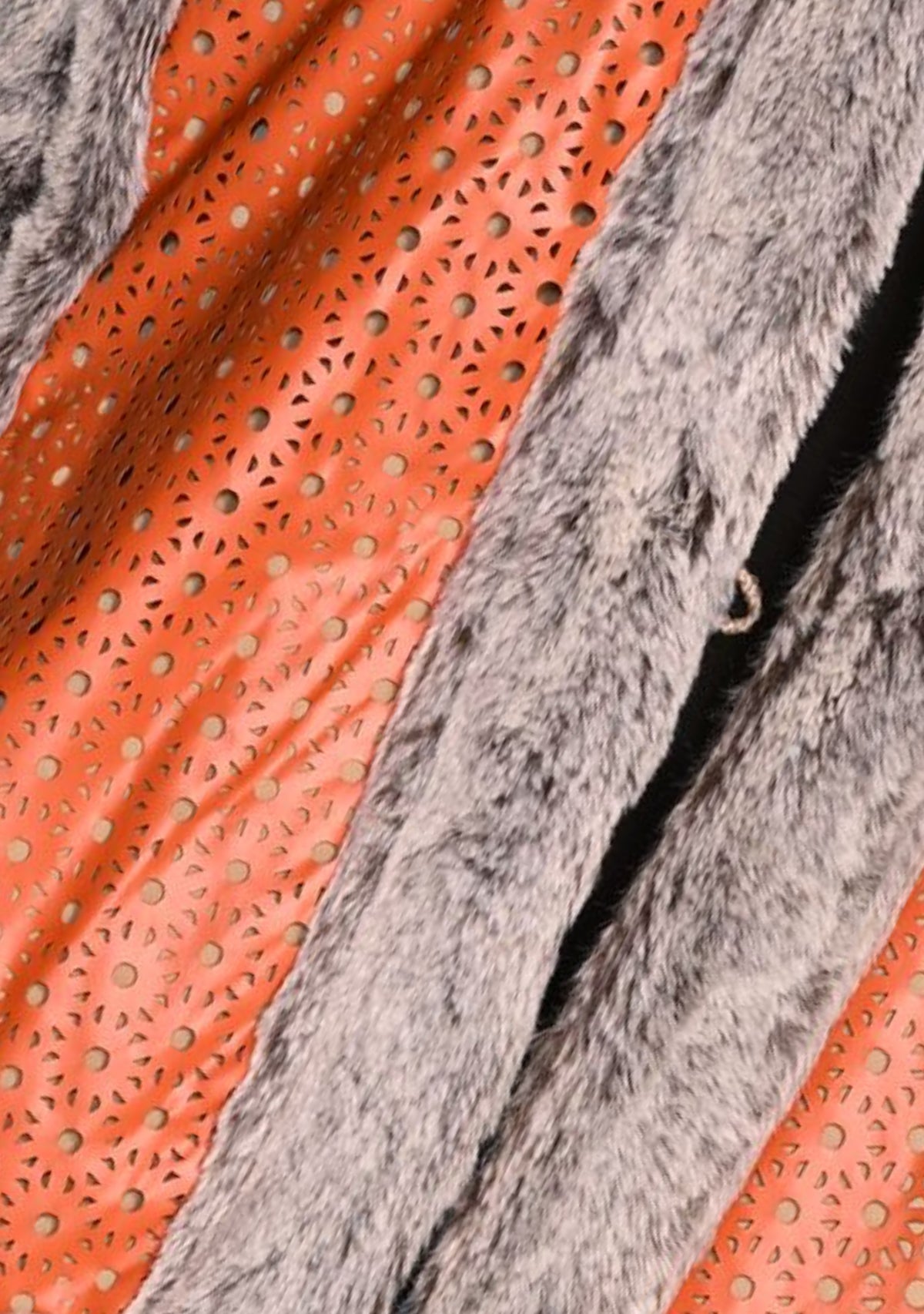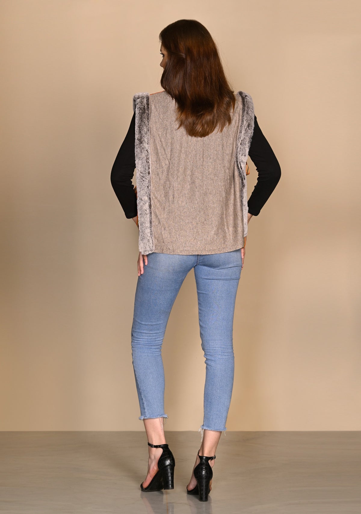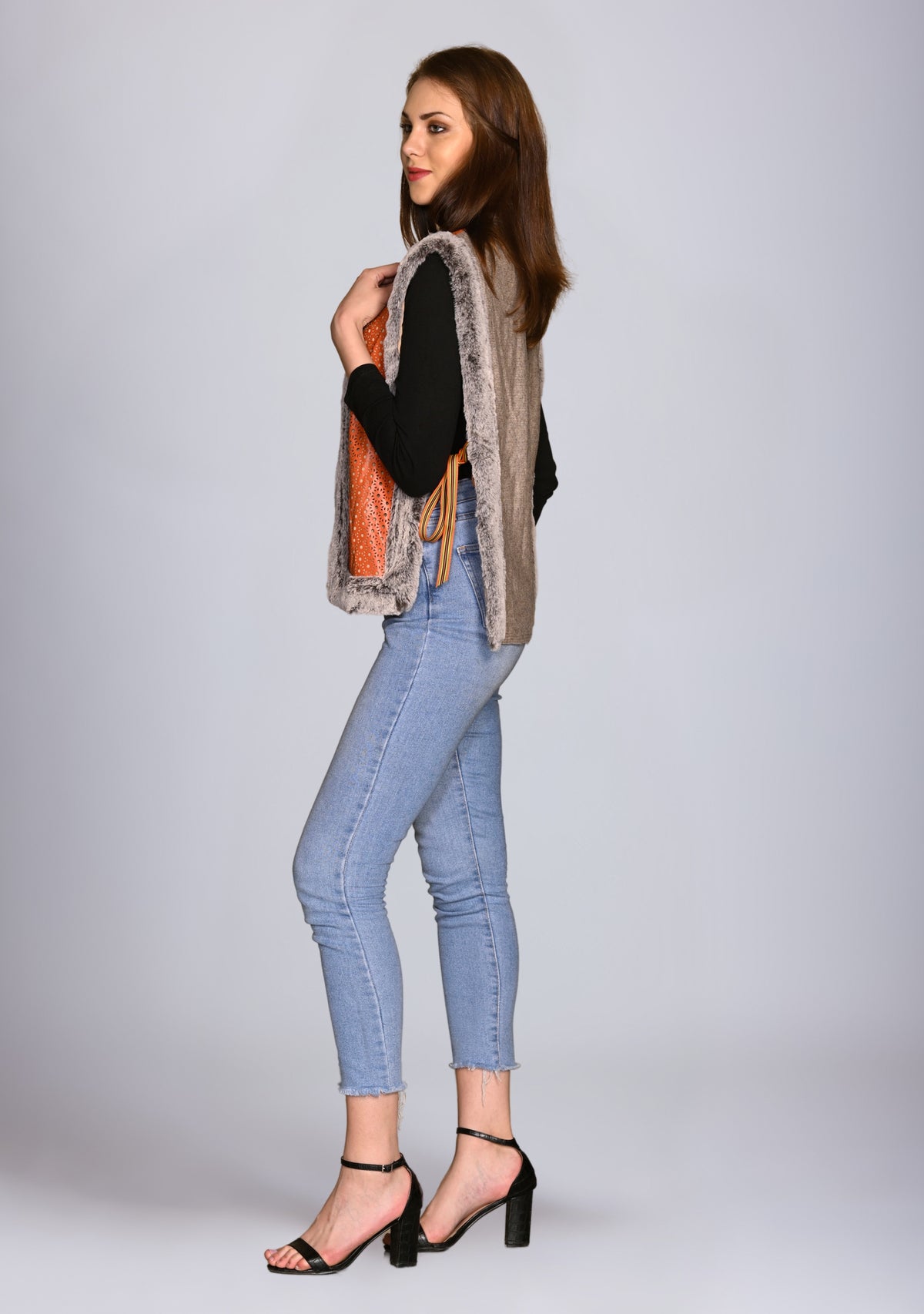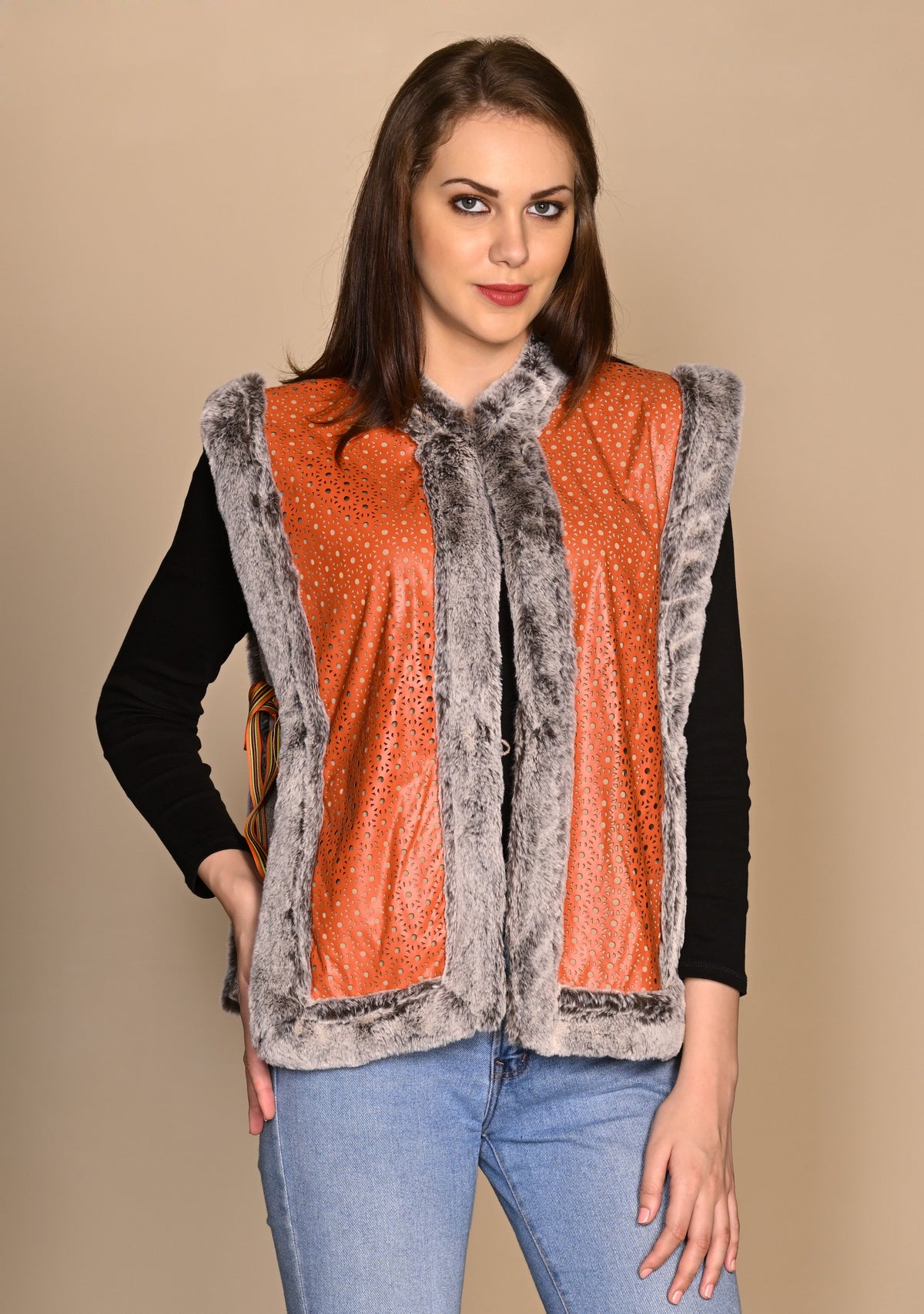 Orange Faux Leather & Taupe Melange Wool Sleeveless JacketTaupe Faux Fur