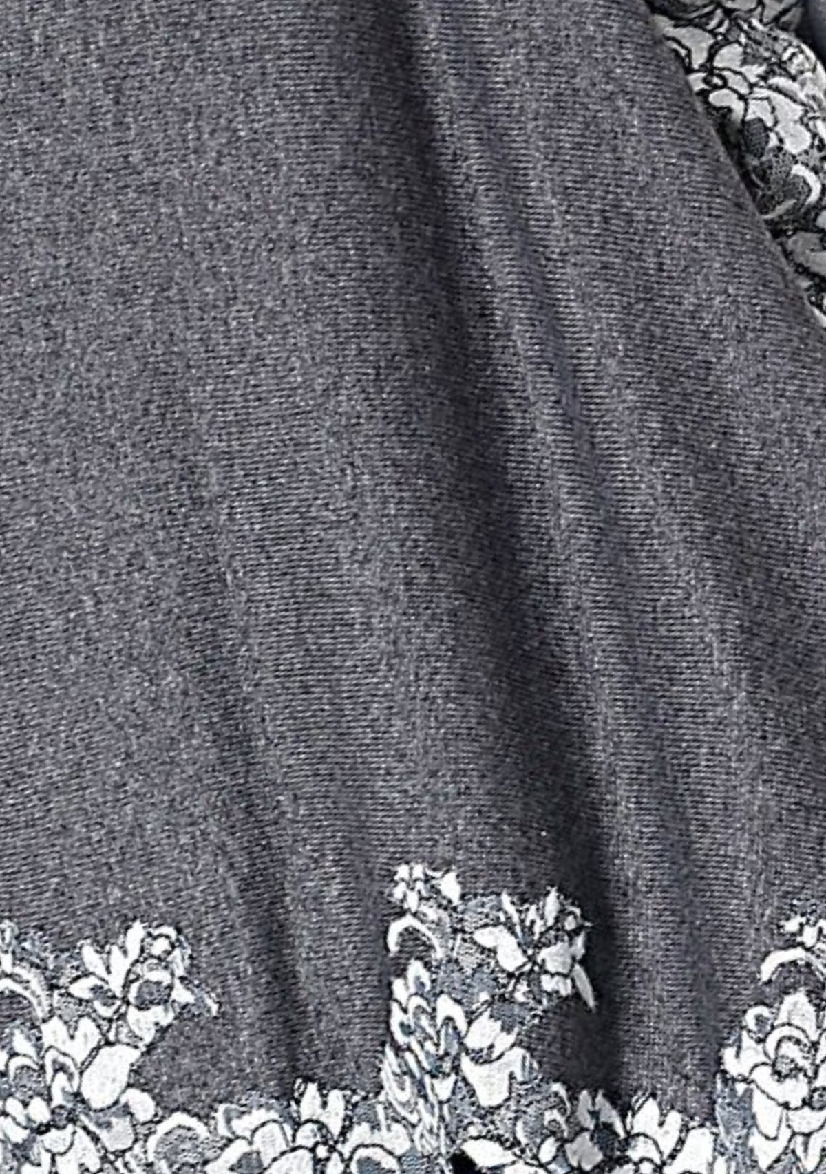 This is a classic knitted dark gray melange poncho crafted from a very fine wool. It is elevated with the intricate application of a contrasting black-outlined ivory Chantilly lace border. Striking and stylishly warm, this poncho makes for a head-turning addition to any outfit.