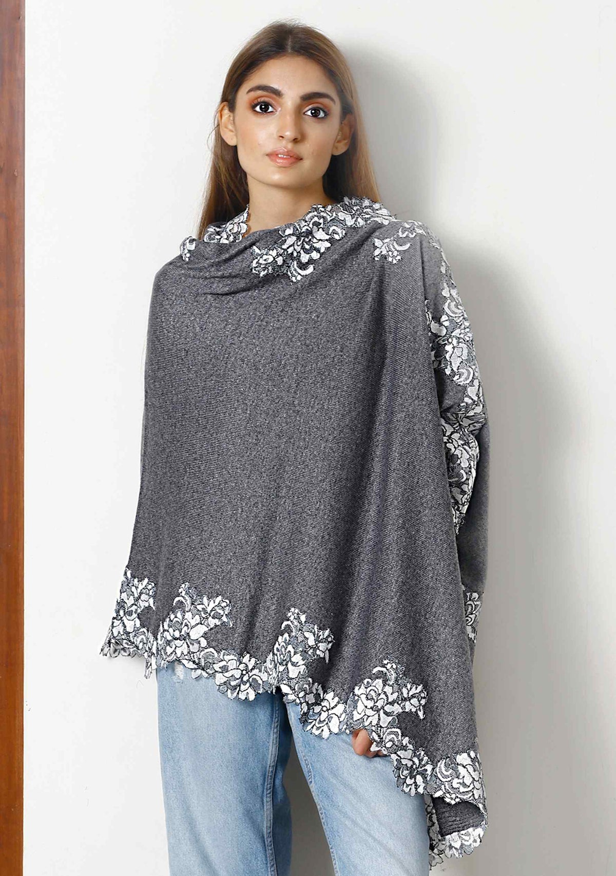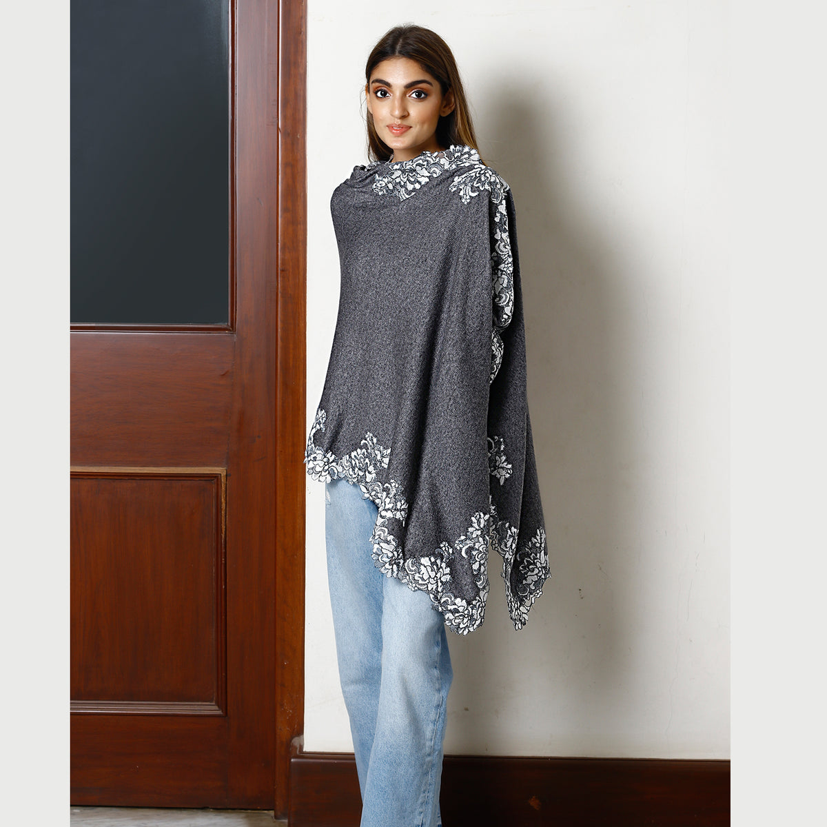 Dk. Gray Melange Wool Poncho Ivory Lace