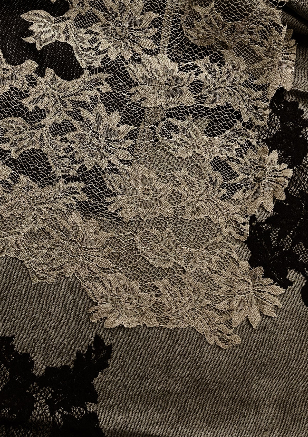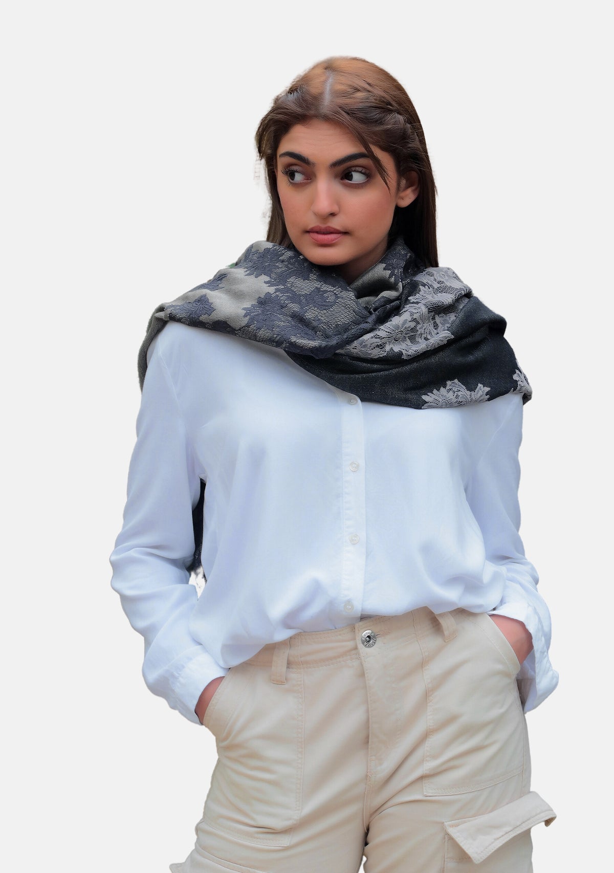 Woven from a fine wool and silk blend, this reversible dual color black and taupe scarf is a stunning and unique creation featuring a contrasting and generous dual color taupe and black floral lace application and border. This is an extremely versatile piece that can be styled in multiple ways for day or evening wear whilst keeping you comfortably warm.