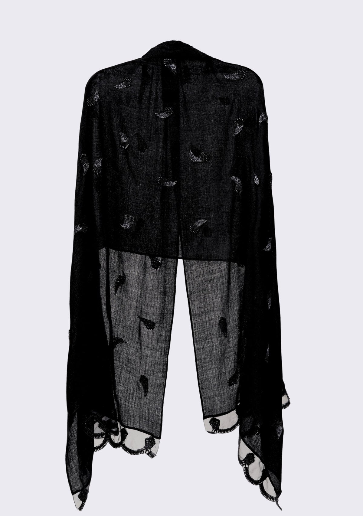 A black cashmere scarf adorned with tonal, brooch-inspired beadwork across the entire scarf. Additionally, it is delicately scalloped with organza fabric with beaded edges on both ends. Created by two skilled artisans working in tandem, this scarf takes 36 hours to complete, exemplifying meticulous craftsmanship. Ideal for weddings, soirées, or any occasion that calls for understated glamour.