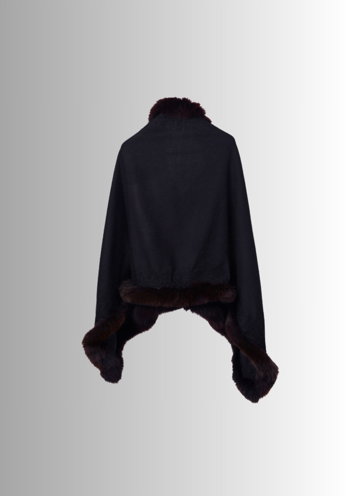 Black Cashmere Stole Brown Fox Fur & Black Floral Lace