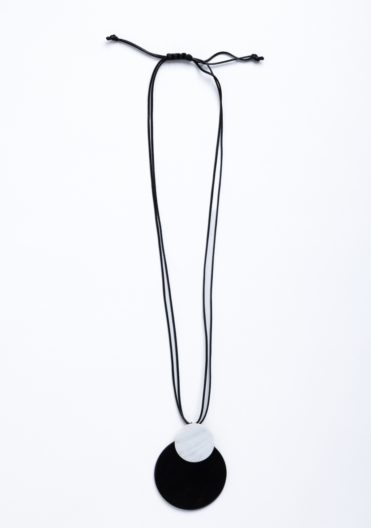 Black Cord with Black Buffalo Horn Disk & White Shell Disk Pendant Necklace