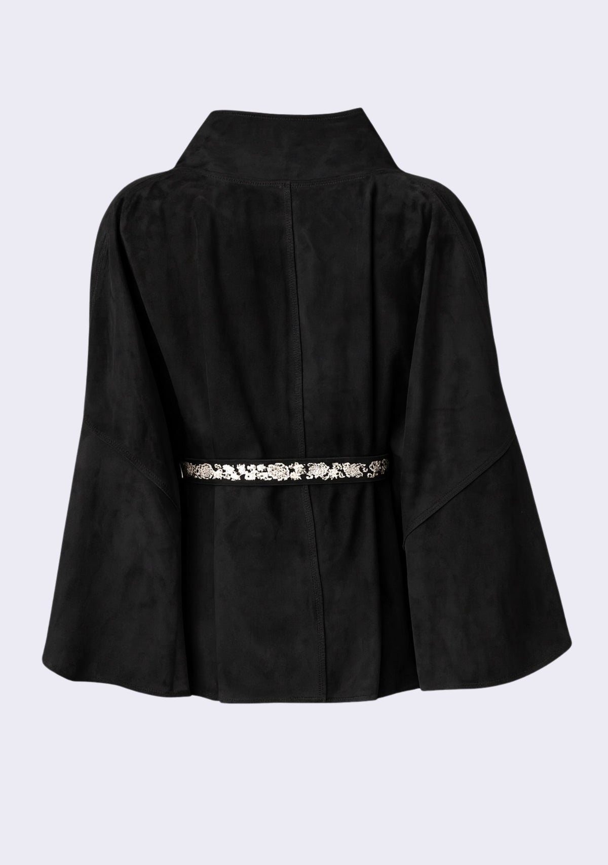 The black colored Aurora suede jacket takes the cape silhouette and gives it a modern edge. Cut from soft suede leather, it's finished with a sharp standing collar and a tie-waist belt hand-detailed in contrasting ivory embroidery. The shape pulls in at the waist yet moves freely, making it the go-to layer for transitional seasons. Whether layered over everyday basics or styled with a dress. Aurora is contemporary elegance.