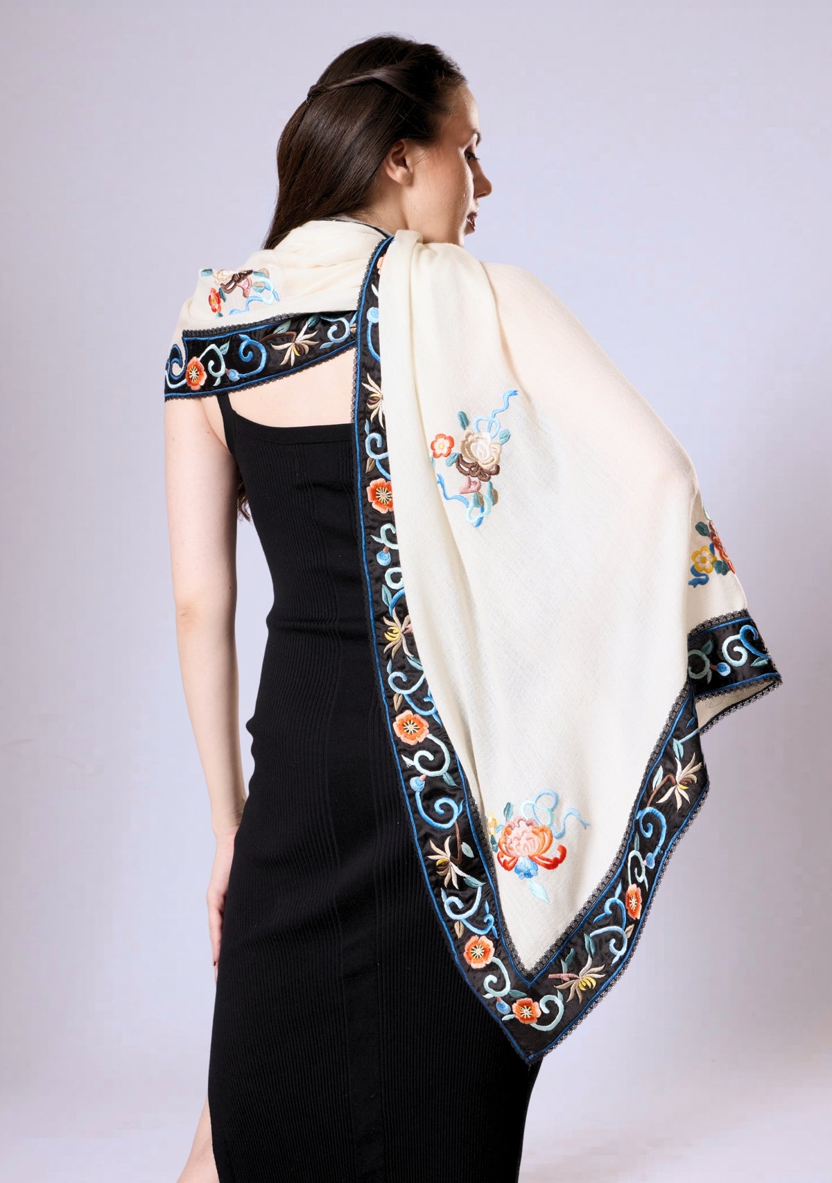 Ivory Cashmere Scarf  Black Multi-colored Embroidery & Black Lace
