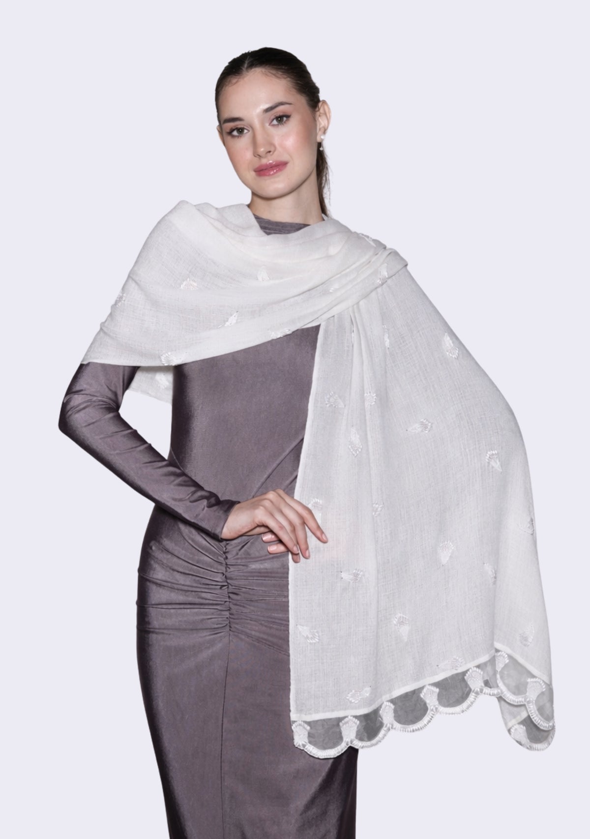 An ivory cashmere scarf adorned with tonal, brooch-inspired beadwork across the entire scarf. Additionally, it is delicately scalloped with organza fabric with beaded edges on both ends. Created by two skilled artisans working in tandem, this scarf takes 36 hours to complete, exemplifying meticulous craftsmanship. Ideal for weddings, soirées, or any occasion that calls for understated glamour.