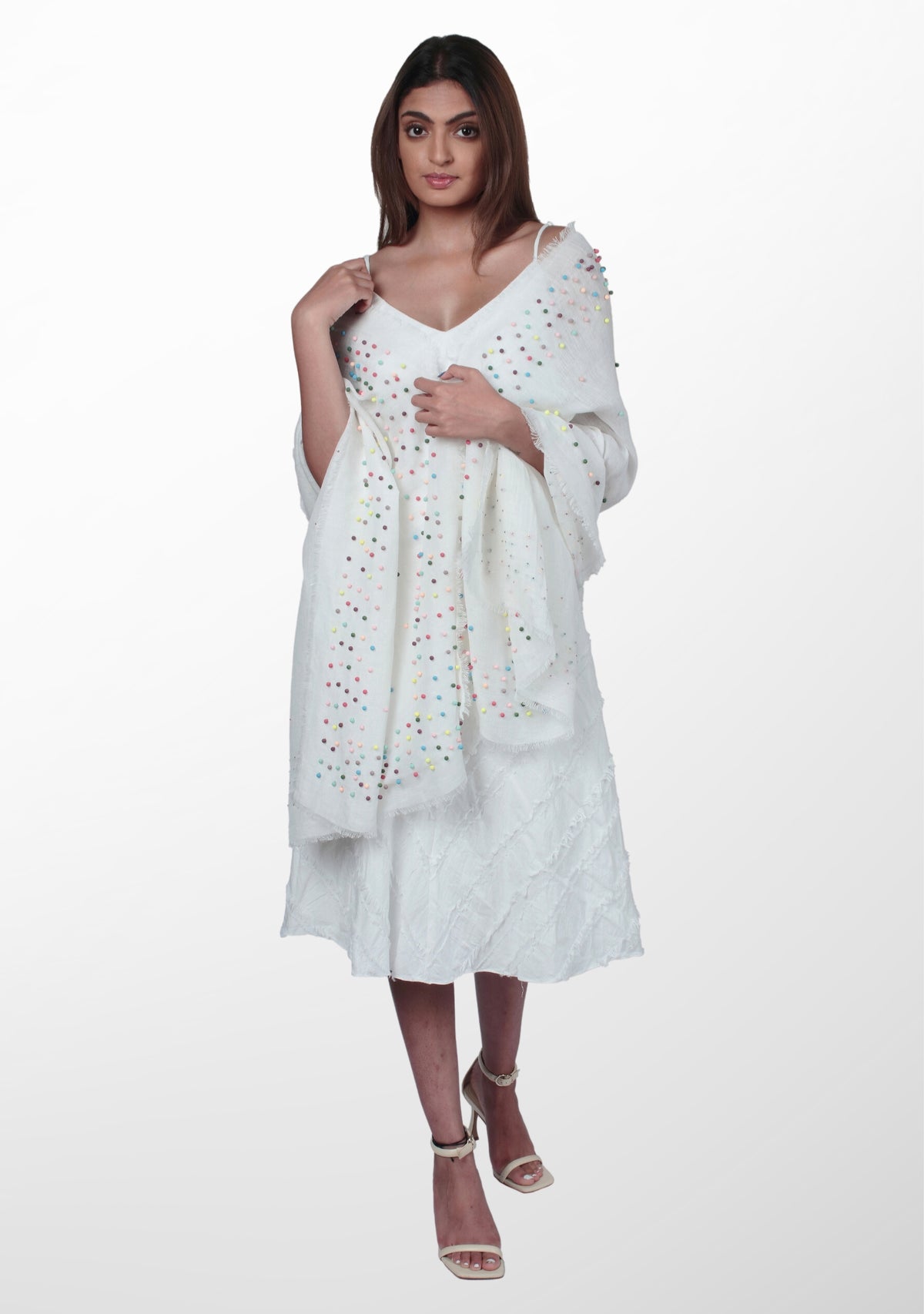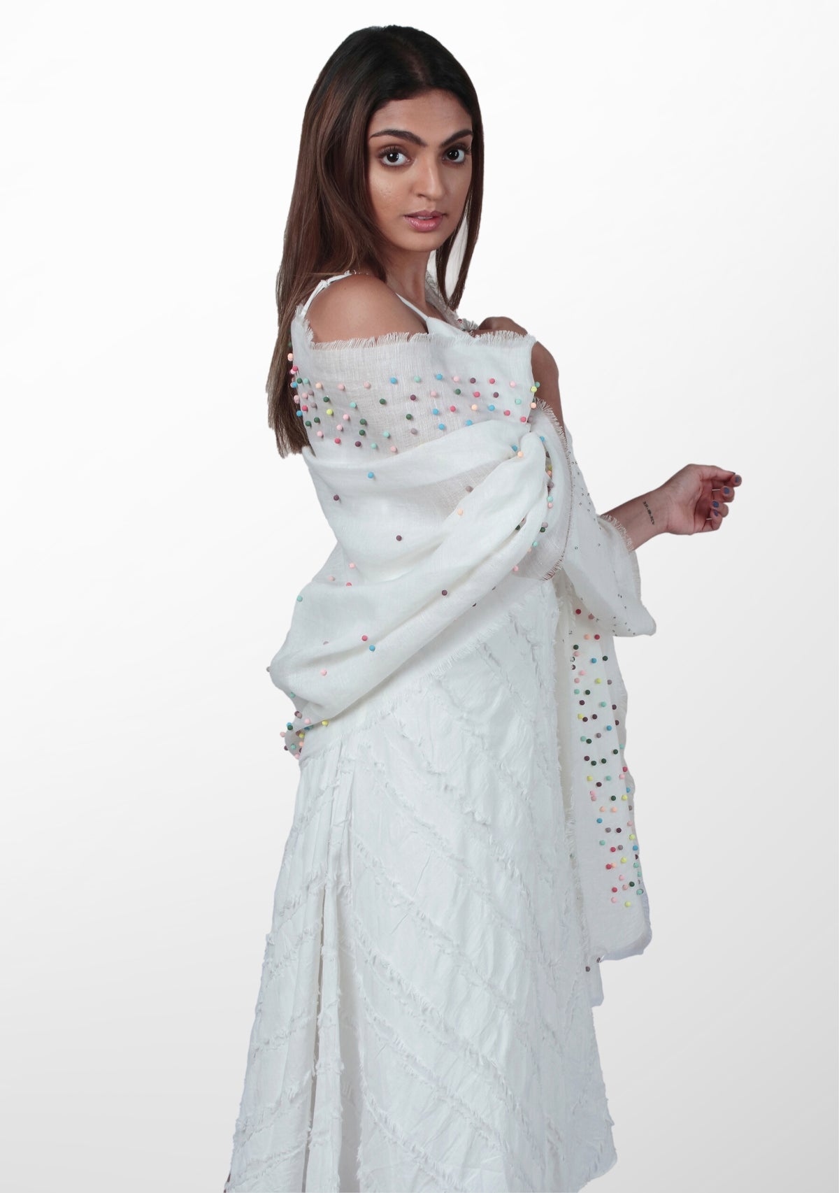 This ivory linen and modal blended scarf adds a playful and unique touch to your style. It features fun and quirky multi-colored rudraksha pearls, delicately scattered across the scarf and as an inner border. This lightweight and breathable accessory is perfect for any occasion and time, adding a pop of color and a hint of whimsy to your ensemble. Elevate your fashion game with this charming scarf.