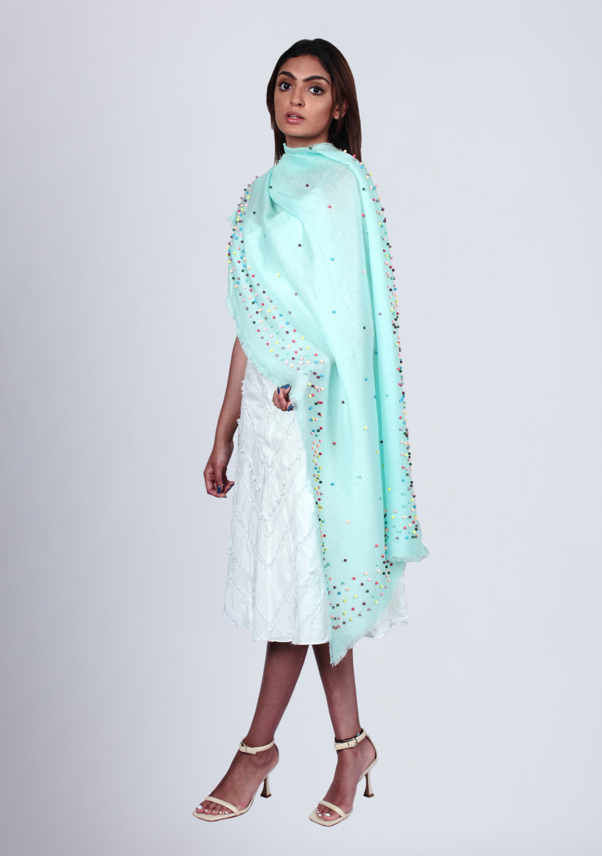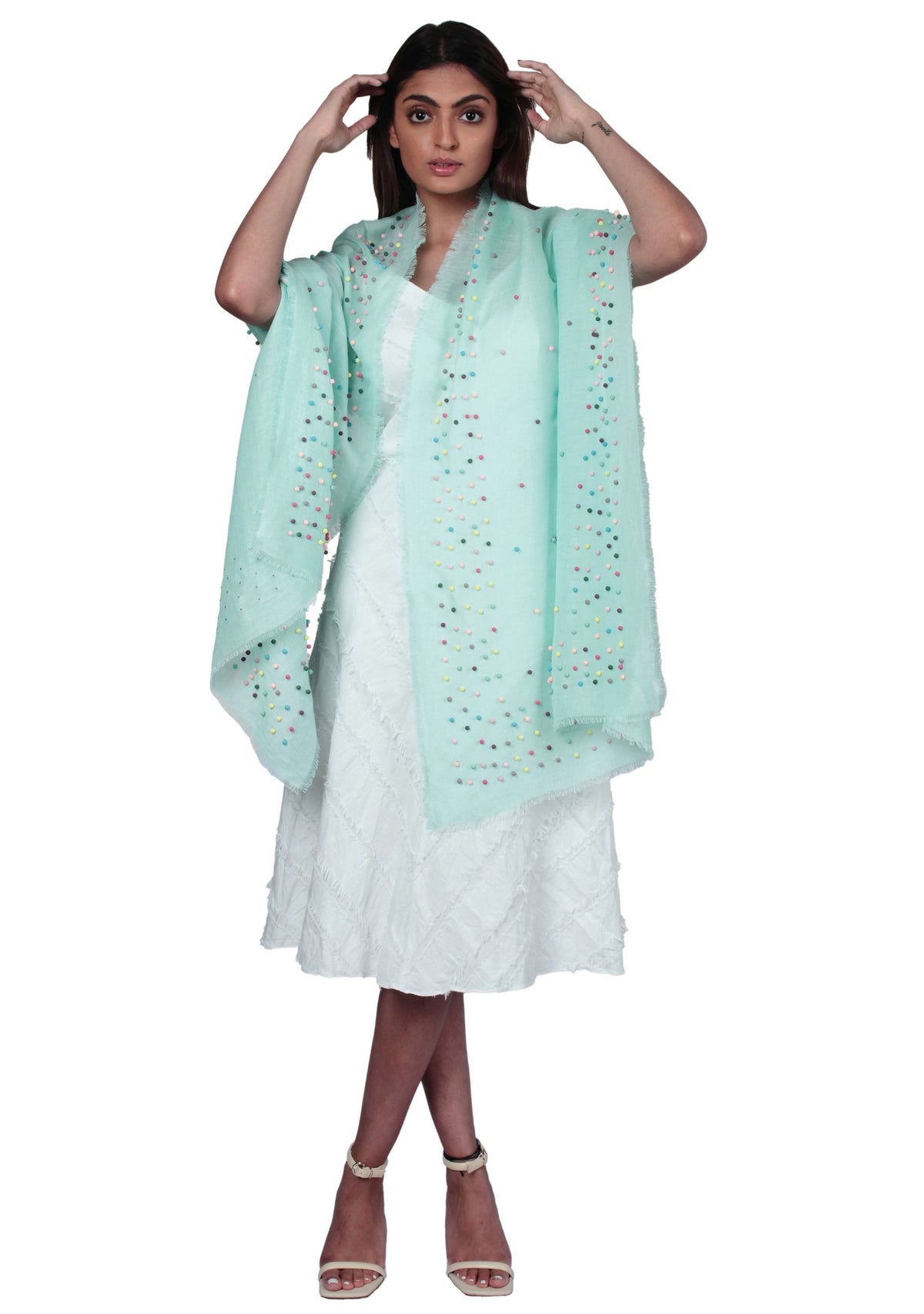 Elevate your style with this light mint linen and modal blended scarf. The delicate and refreshing color adds a touch of serenity to your look. Adorned with fun and quirky multi-colored rudraksha pearls scattered all over and as an inner border, it creates a playful and whimsical vibe. The lightweight and breathable fabric ensures comfort and versatility. Stand out from the crowd and embrace your unique sense of fashion and individuality with this delightful scarf.