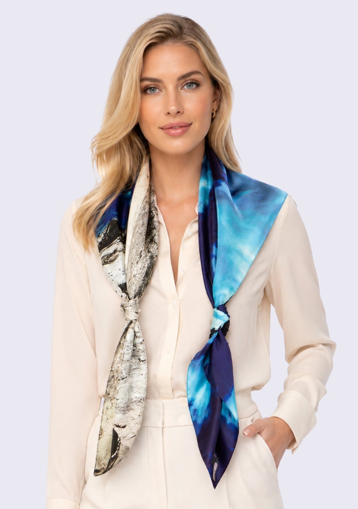 Inspired by the natural artistry of faraway landscapes, this classic silk square scarf features a Mammoth Hot Springs print drawn from Maneesha’s travels. Crafted from premium silk, it offers a fluid, lightweight drape with a soft, luminous sheen that embodies refined luxury.