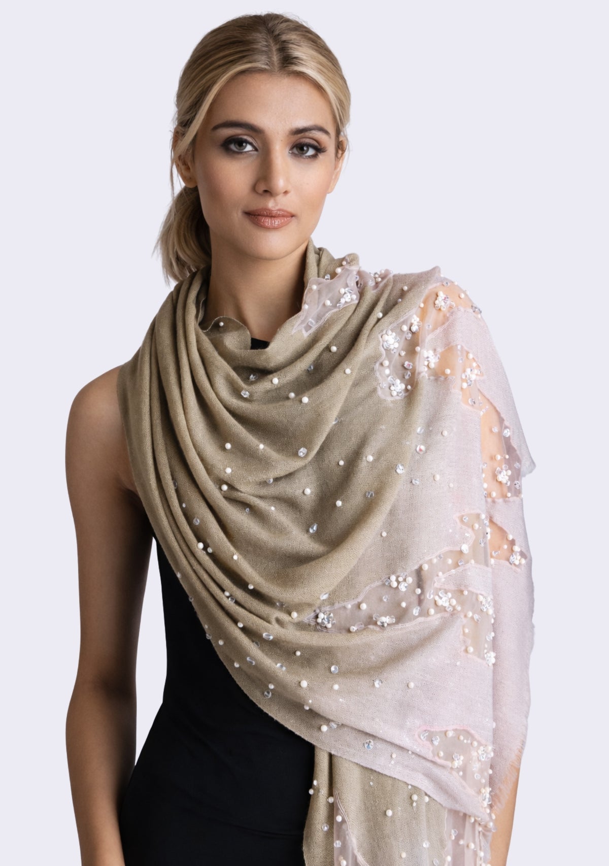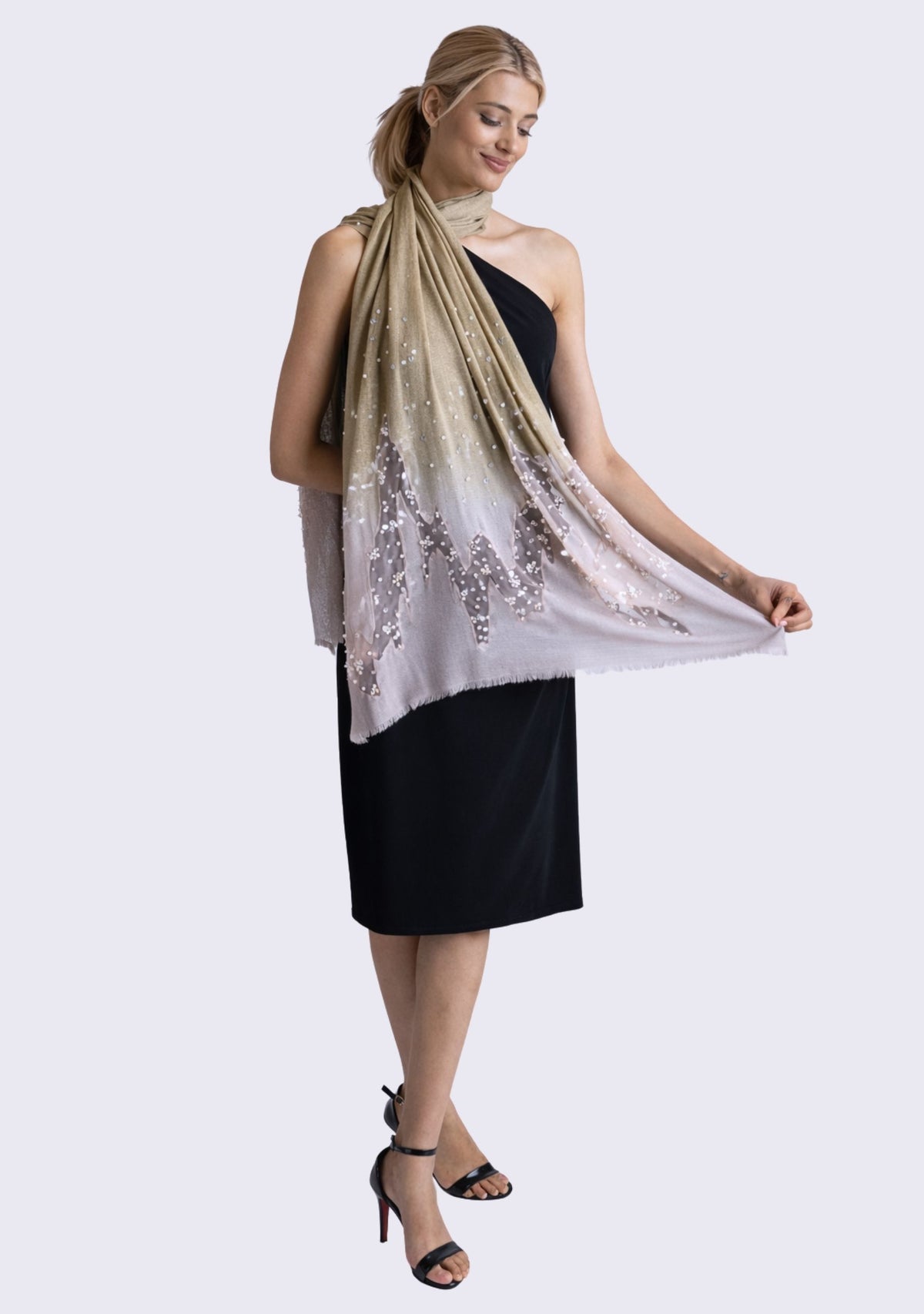 Transform your wardrobe with our stunning mousse-khaki ombre cashmere scarf, featuring a seamless gradient of warm, earthy hues. Adorned with sparkling silver Rhinestones and delicate white pearls, this scarf showcases a unique handcrafted design that radiates elegance and sophistication. Crafted from luxuriously soft 100% cashmere, it provides both warmth and comfort, making it a versatile accessory for any occasion. Worn as a statement piece, this exquisite scarf effortlessly elevates your style, combining modern flair with timeless beauty.