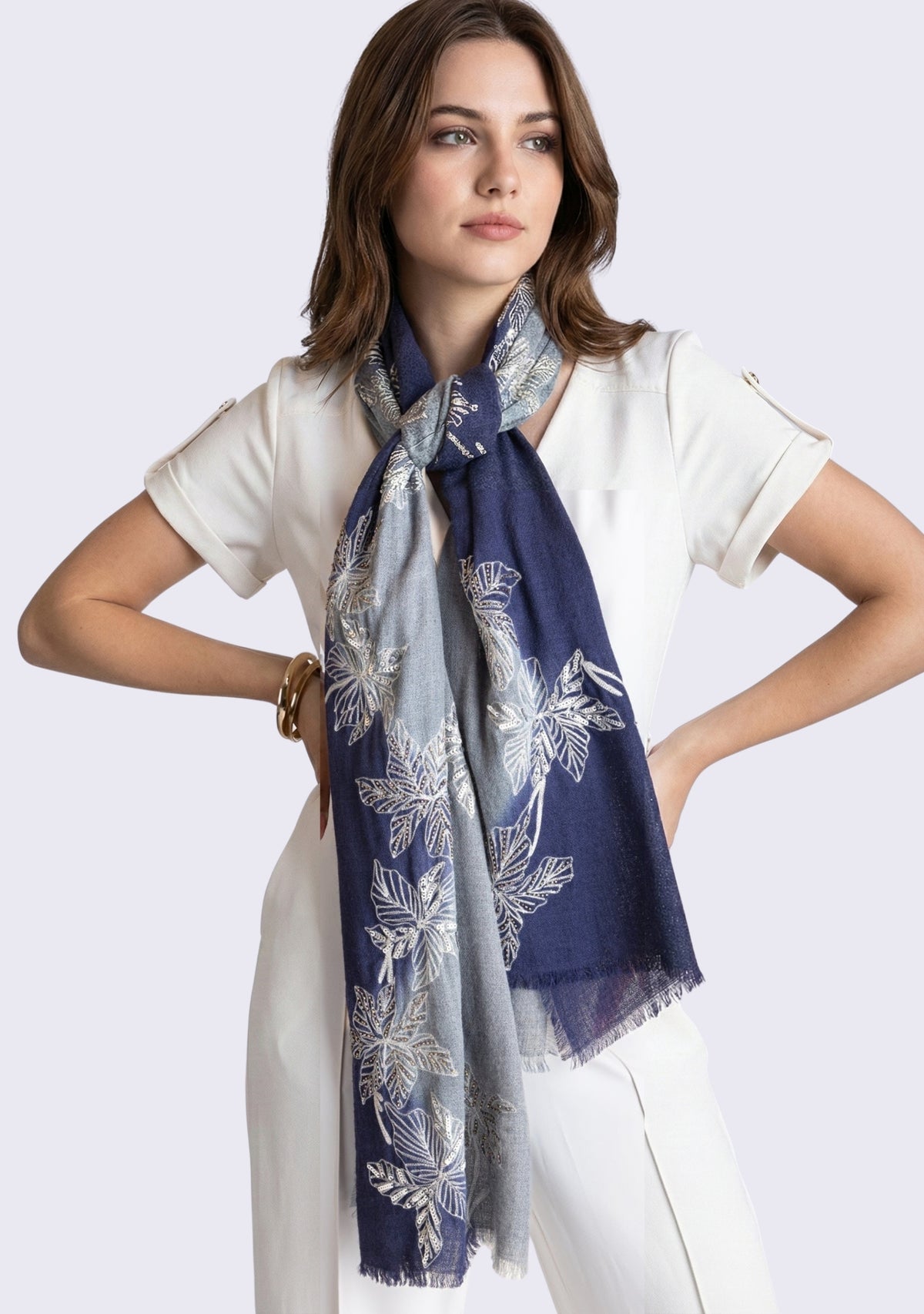 Elevate your style with our navy blue and steel gray ombre scarf, a luxurious and captivating accessory that combines the softness of cashmere with the sparkle of metallic embellishments. The ombre transition from navy blue to steel gray creates a stunning depth, while the silver sequin and metallic leaf embroidery add a touch of glamor and sophistication to any outfit. This scarf provides warmth and comfort while making a bold fashion statement. Whether draped casually or styled for a special occasion, this exquisite accessory is a must-have for those who appreciate refined elegance and contemporary flair.
