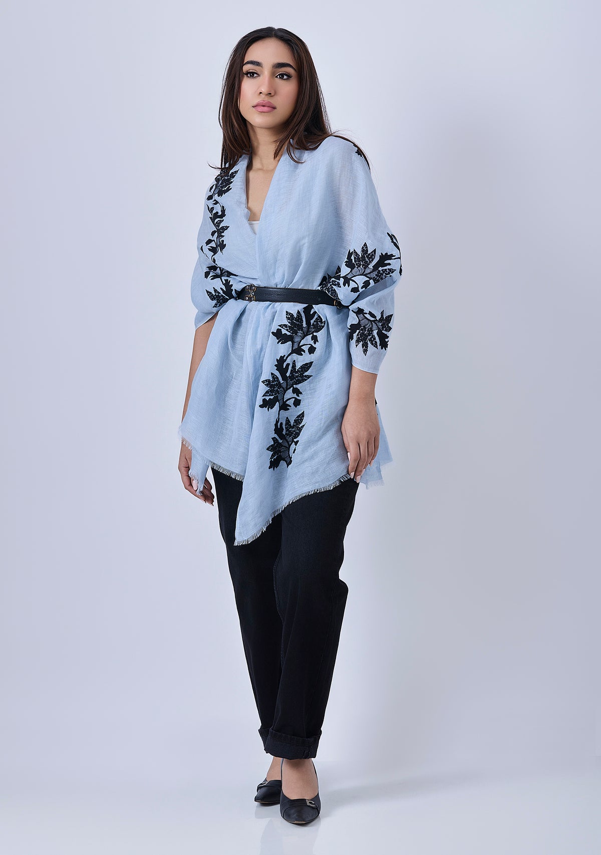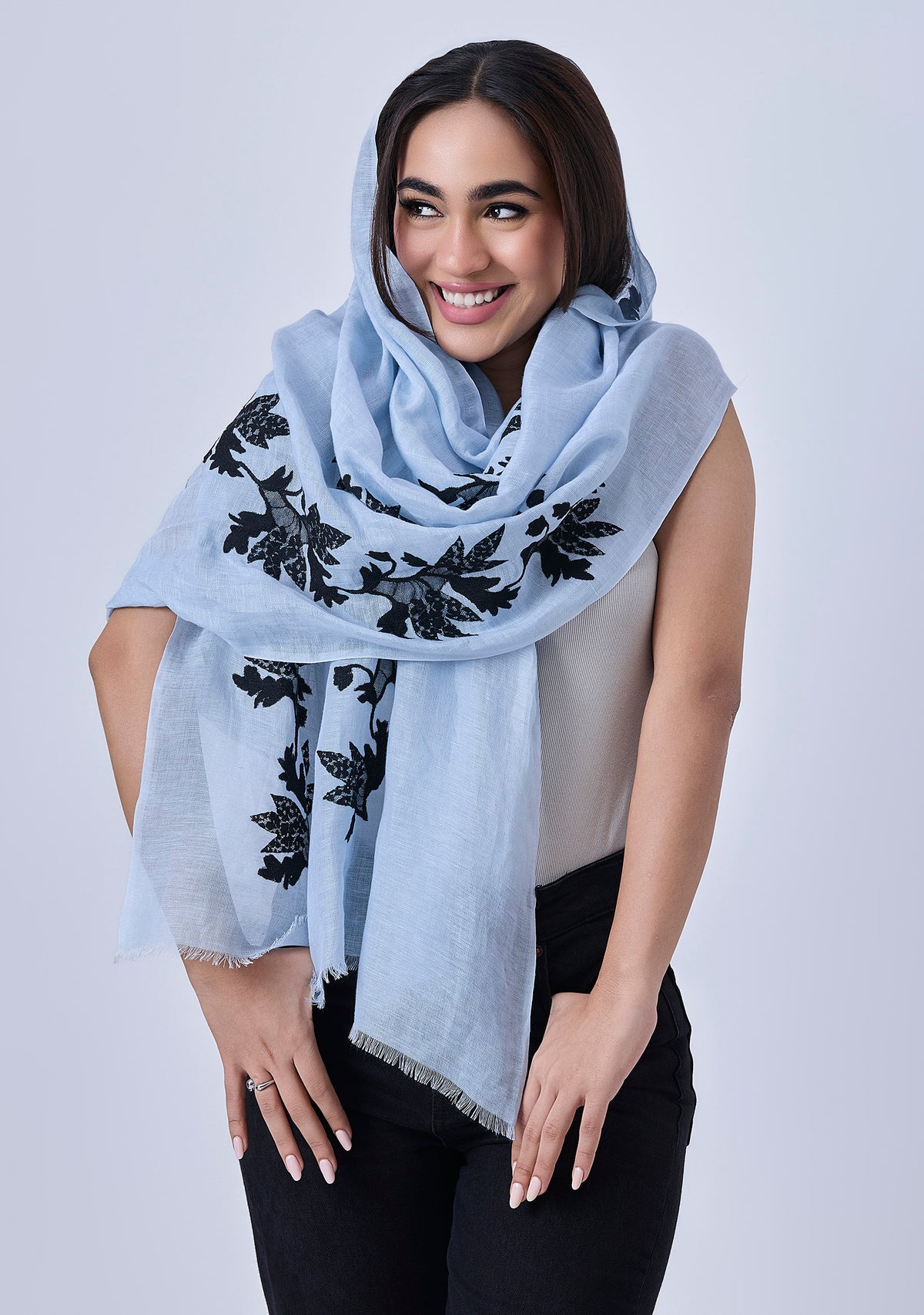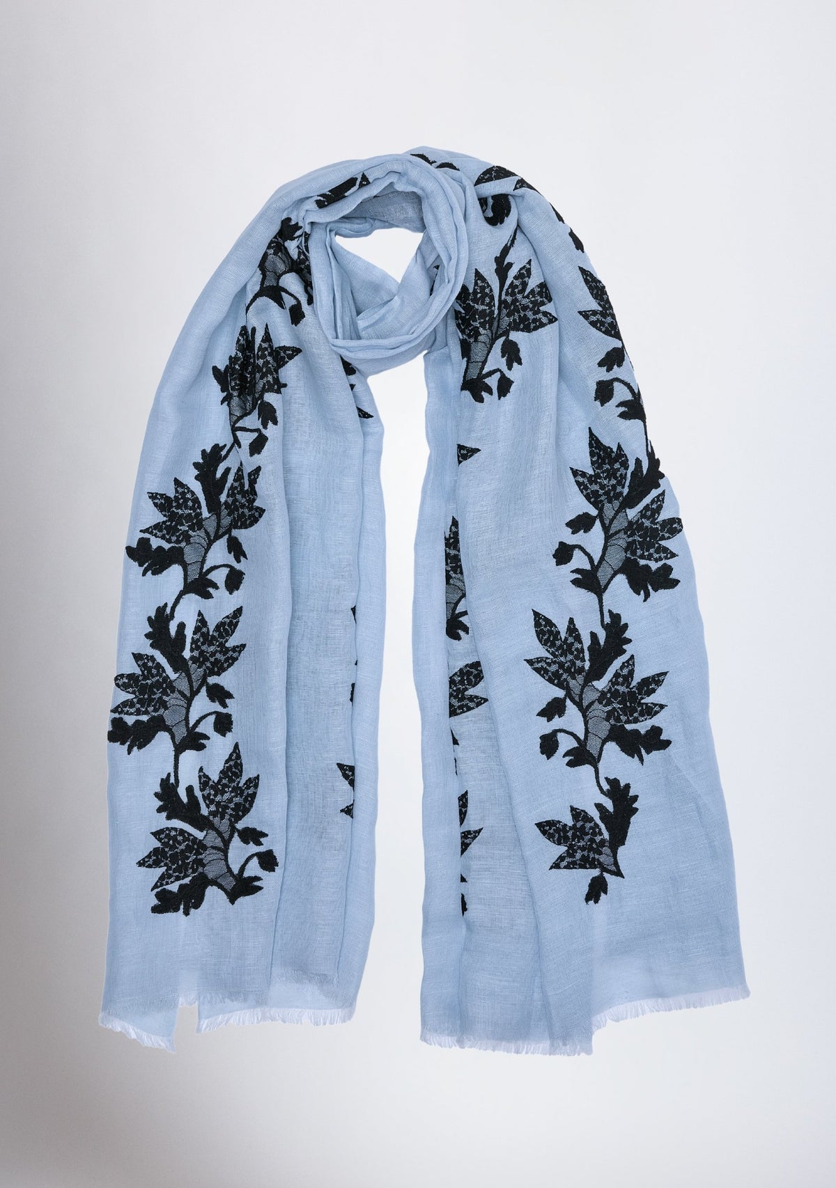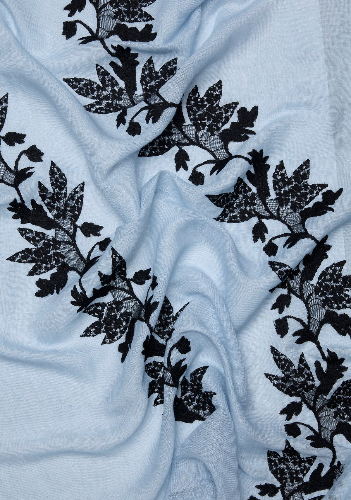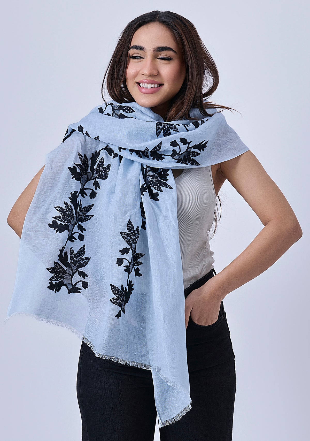 This handcrafted lace scarf is made from a supple blend of linen and modal which has a soft, breathable texture, perfect for all seasons. This powder blue women's scarf is adorned with a black lace appliqué in a delicate creeper design, adding a touch of nature-inspired sophistication. The intricate lacework creates a stunning contrast against the powder blue fabric, perfect for elevating spring and summer events or casual everyday luxury.