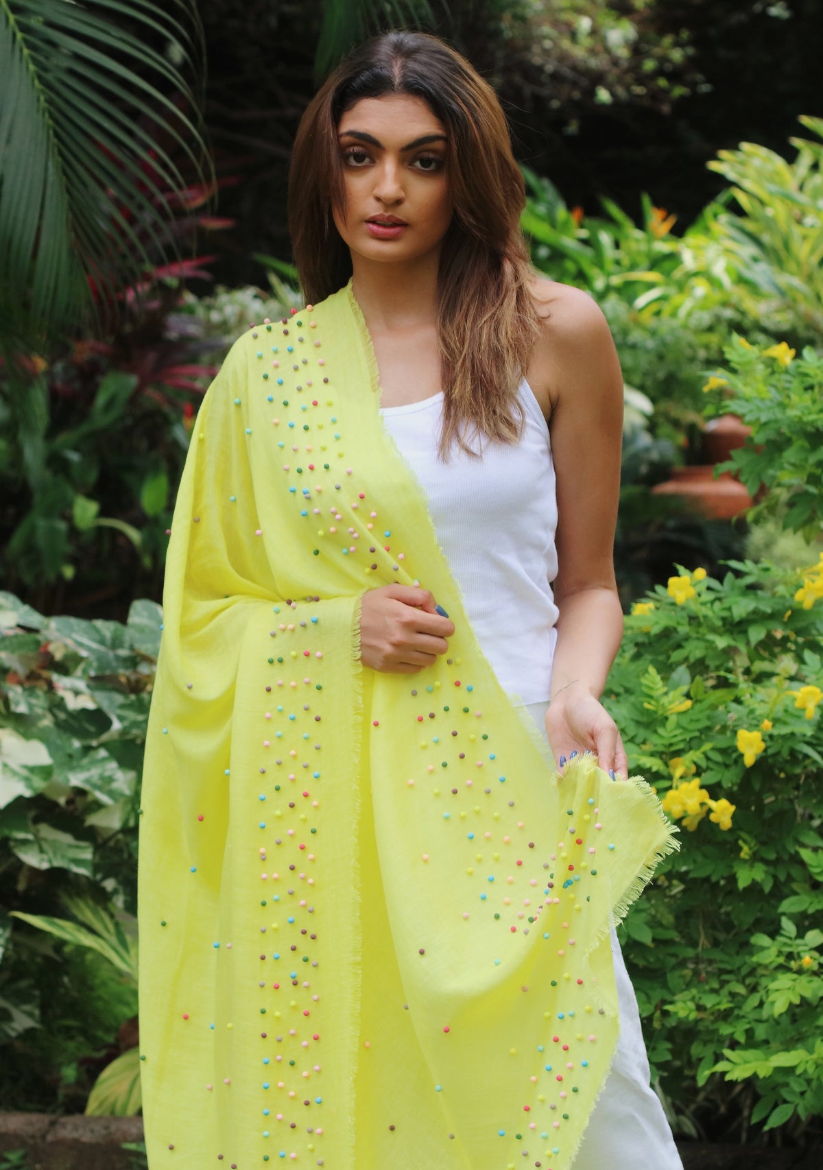 Infuse your look with a vibrant burst of color by styling yourself with this yellow linen and modal blended scarf. Its lightweight and breathable fabric makes it an ideal and easy-to-wear accessory. The scarf is adorned with fun and quirky multi-colored rudraksha pearls, delicately scattered across and as an inner border, adding a playful and whimsical touch to your outfit. Stand out from the crowd and embrace your individuality with this enchanting scarf that effortlessly combines comfort, style, and a unique flair.
